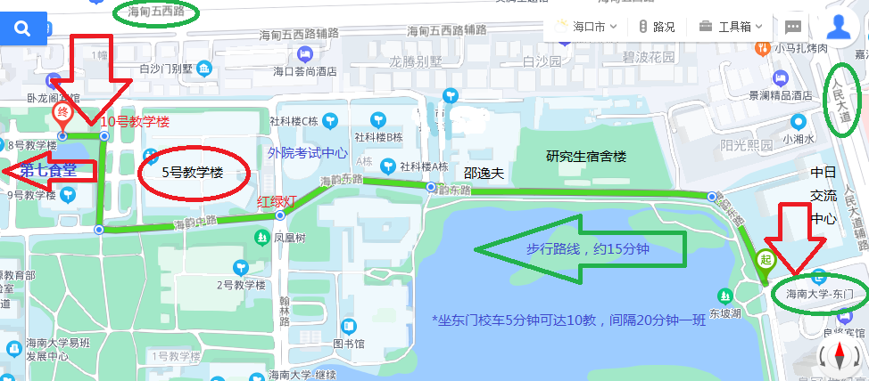 考试期间,考生进入海南大学日本语能力测试考点的唯一通道是海大海甸校区东门(海南省海口市海甸岛人民大道58号)。此考点不提供停车服务,请考生步行进入东门。海大东门和考点(五号教学楼/十号教学楼)之间约有900米距离,请预留足够时间抵达考场。