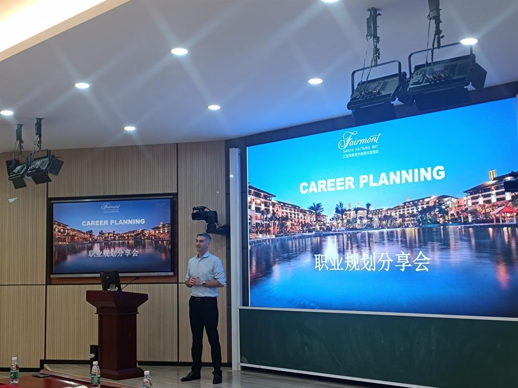 2022年6月14日下午,公海gh555000aa线路检测在1-421教室成功召开职业规划分享会。本次分享会邀请到三亚费尔蒙酒店经理Vedat Yildirim(德国)和三亚费尔蒙酒店人事总监刘春燕(公海gh555000aa线路检测(原应用外语系)95级商英员工)做职业规划分享,21级商务英语和旅游英语专业全体员工参加。