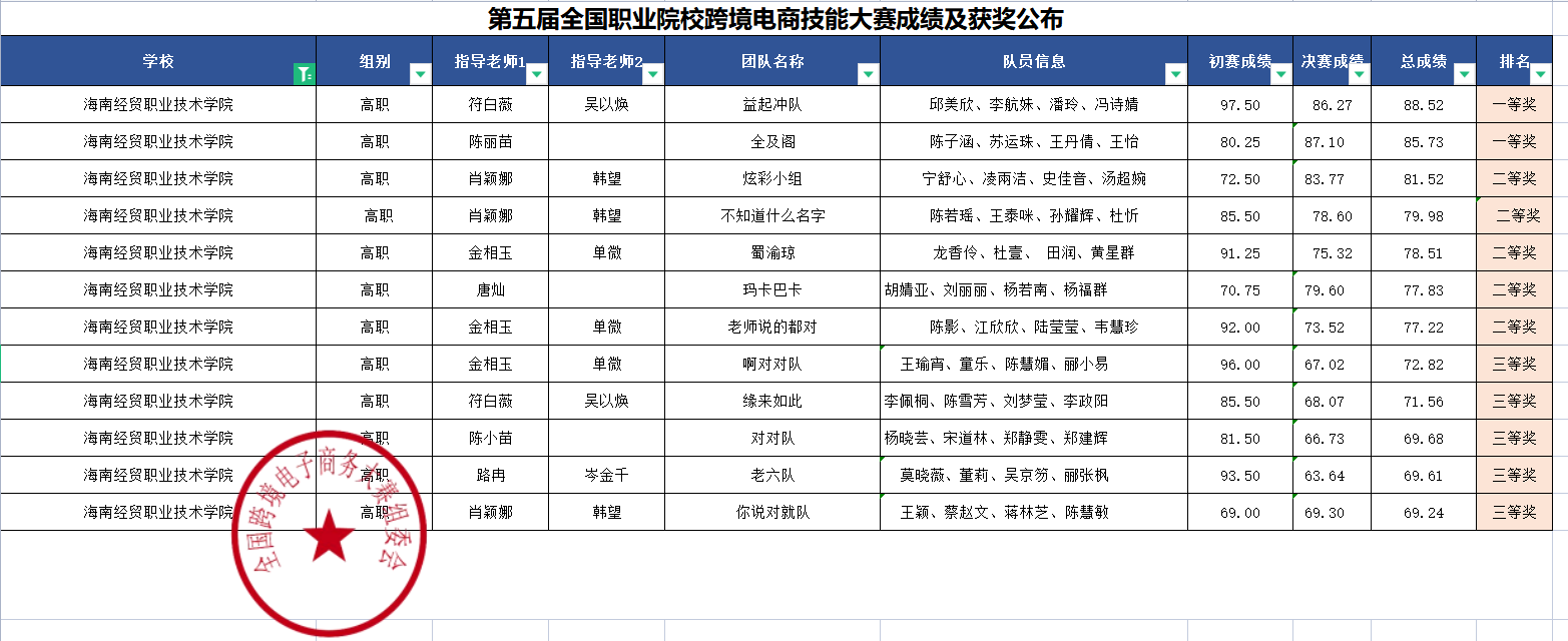 公司参加第五届全国职业院校跨境电商技能大赛(全国赛)取得非常优异的成绩。本次全国大赛共有158所院校、1092个团队、4333名员工参与。其中由符白薇、吴以焕、陈丽苗老师指导的商英团队荣获2个一等奖; 肖颖娜、韩望、唐灿、金相玉、单薇老师指导的商英、旅英、韩语团队荣获5个二等奖;符白薇、肖颖娜、路冉、岑金千、陈小苗老师指导的商英、韩语、日语团队荣获5个三等奖。