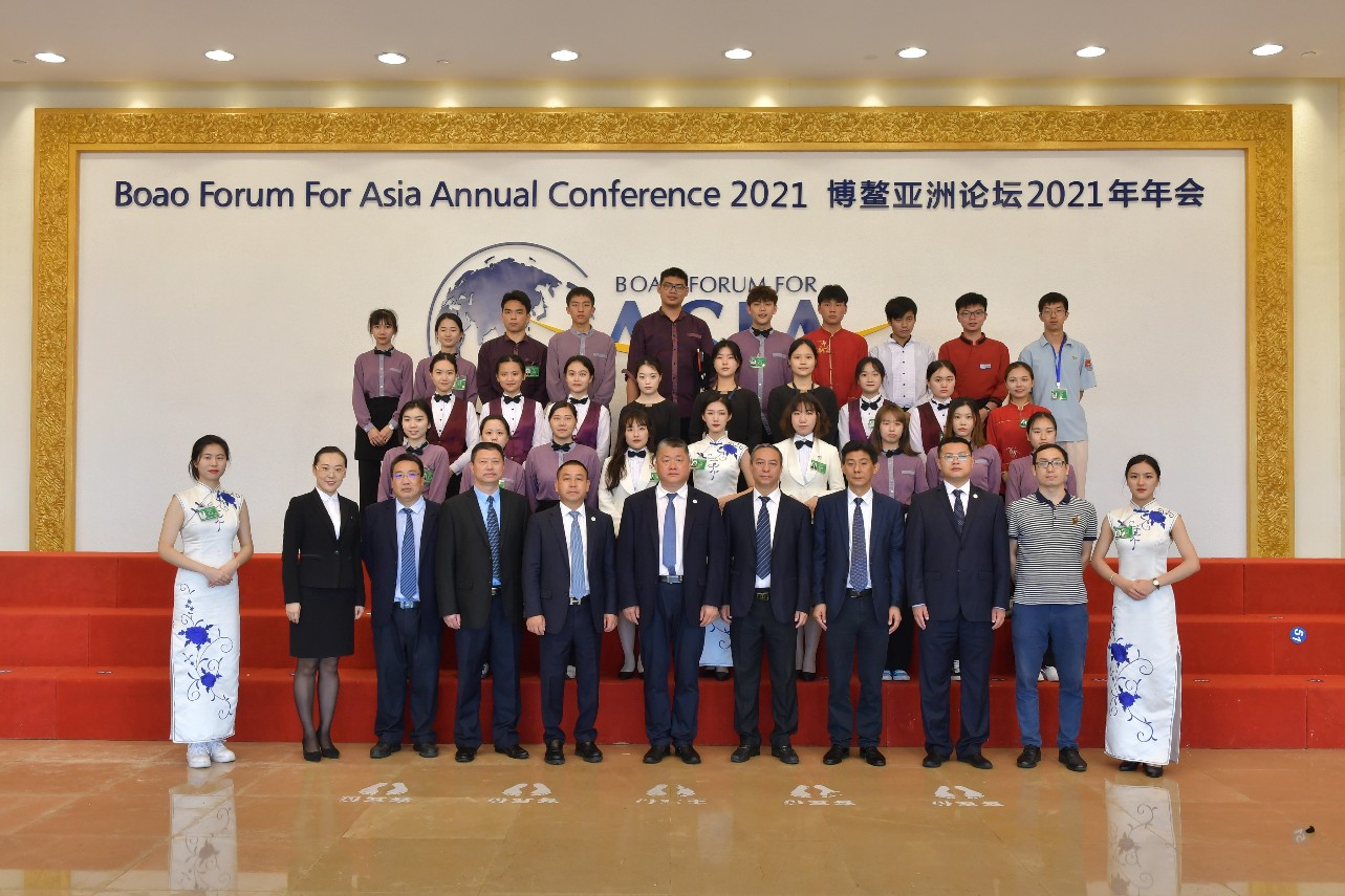 带队老师黄银亮老师及公司志愿者在博鳌亚洲论坛2021年年会合影留念