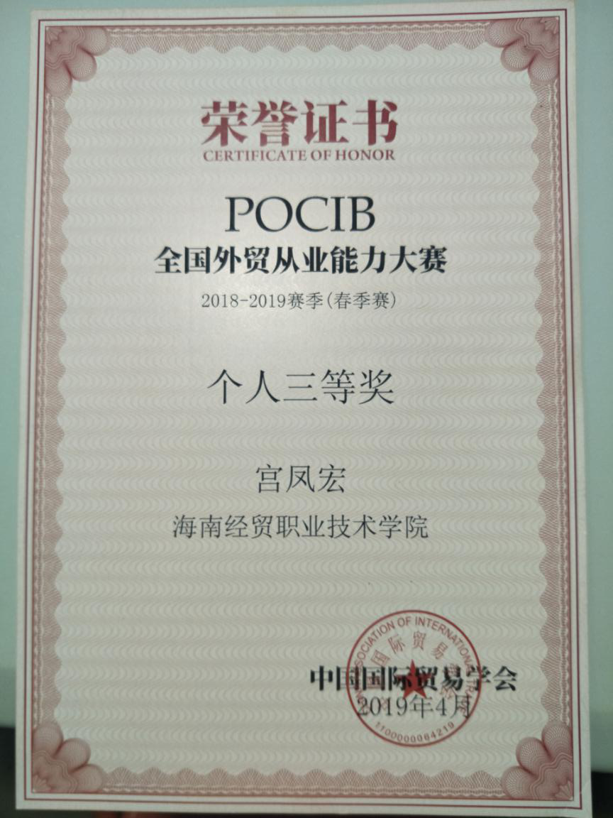 商务英语专业员工宫凤宏在由国际贸易学会主办的POCIB全国外贸从业能力大赛2018-2019赛季(春季)中获高职组三等奖,宫凤宏、周文怡、王秋红、伍子晴和甘琳茜荣获高职组团体三等奖。