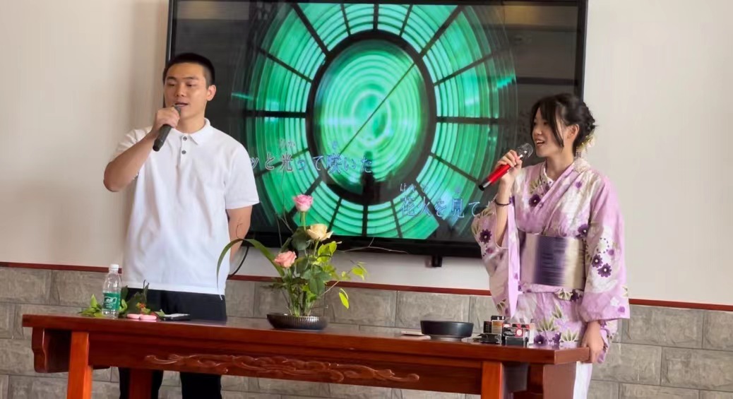 在海口旅游公司的员工前来614教室参加活动中,马娜为他们带去了激昂澎湃的日语演讲—《青春》。然后,林由惠老师为大家介绍了日本的插花艺术——華道,22日语1班张玉为林由惠老师担任日语翻译工作,精准而生动地为员工讲解插花艺术。