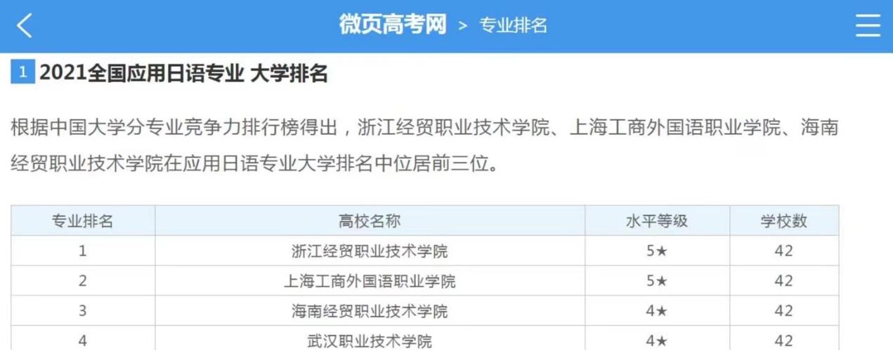 根据中国大学分专业竞争力排行榜,浙江经贸职业技术公司、上海工商外国语职业公司、公海gh555000aa线路检测在应用日语专业大学排名中位居前三位。公司应用日语专业排名第三。(注:全国开设应用日语专业的大专院校共42所。)