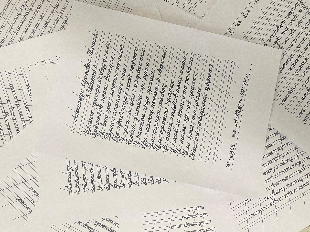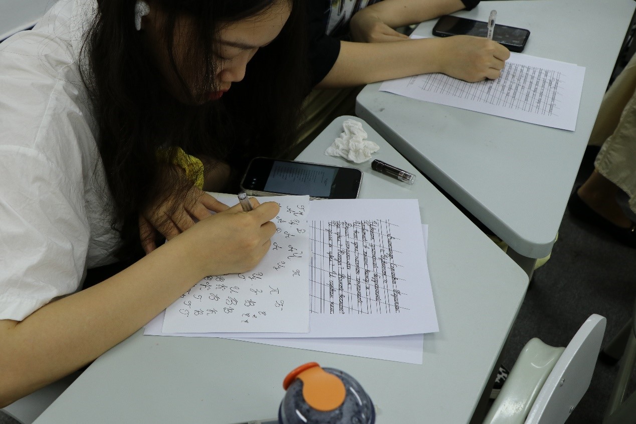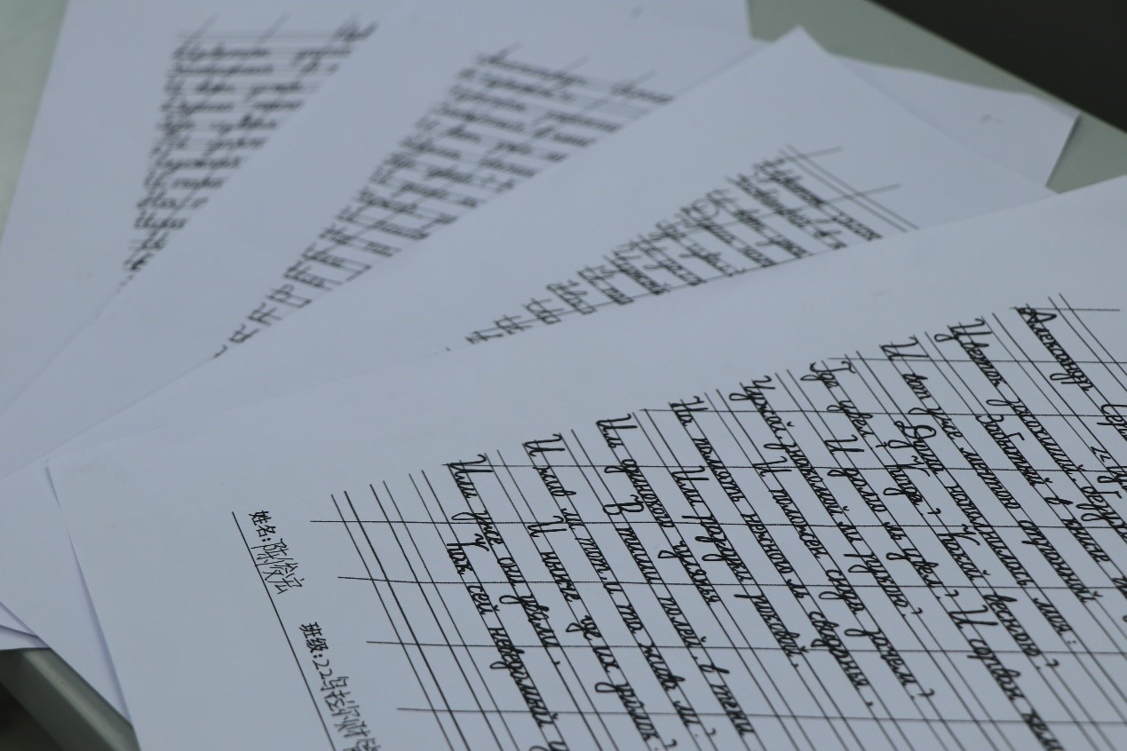 比赛中,同学们坐姿端正、握笔正确、书写认真。他们全神贯注于俄语诗歌的书写中,表现出良好的书写习惯。看,年轻的“书法家们”一笔一画,起伏于峰杪,一收一放,运气于笔尖。在一张张书写纸上记录下自己的伟大创作。