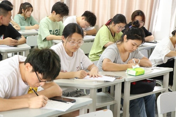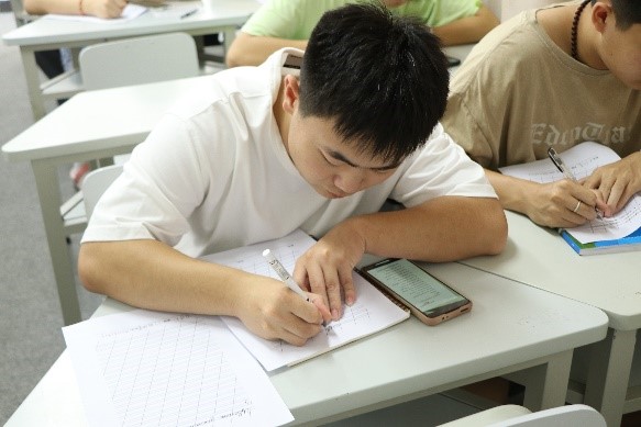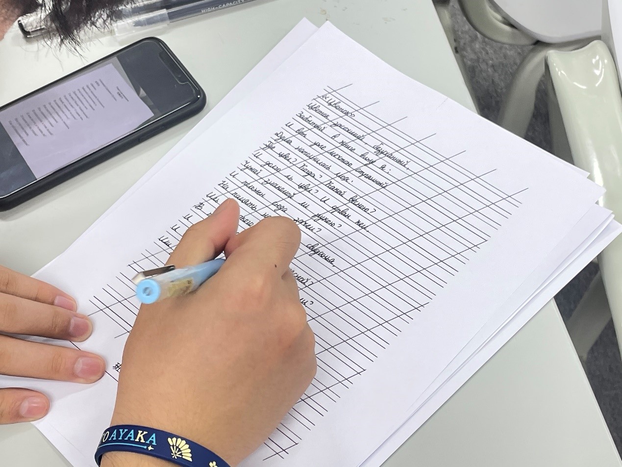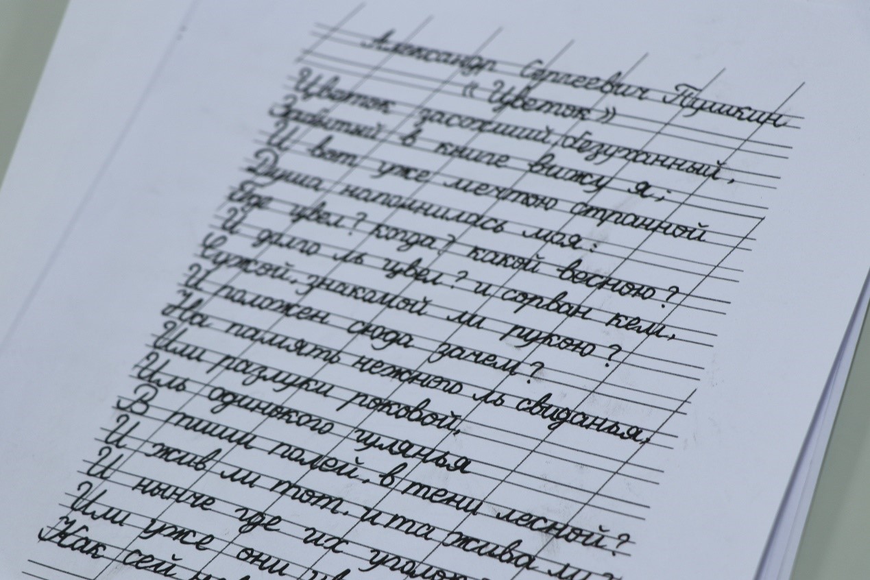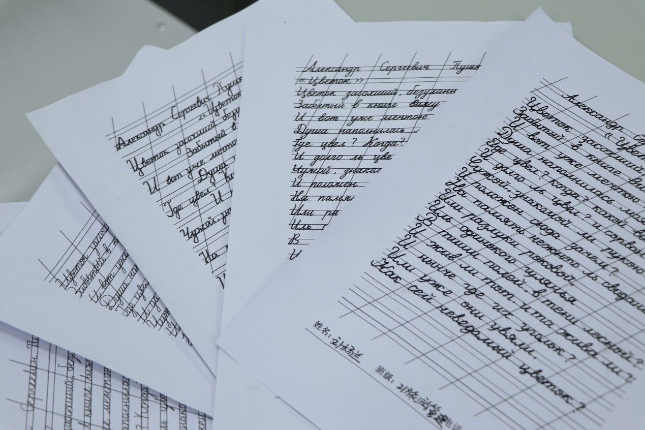 比赛中,同学们坐姿端正、握笔正确、书写认真。他们全神贯注于俄语诗歌的书写中,表现出良好的书写习惯。看,年轻的“书法家们”一笔一画,起伏于峰杪,一收一放,运气于笔尖。在一张张书写纸上记录下自己的伟大创作。