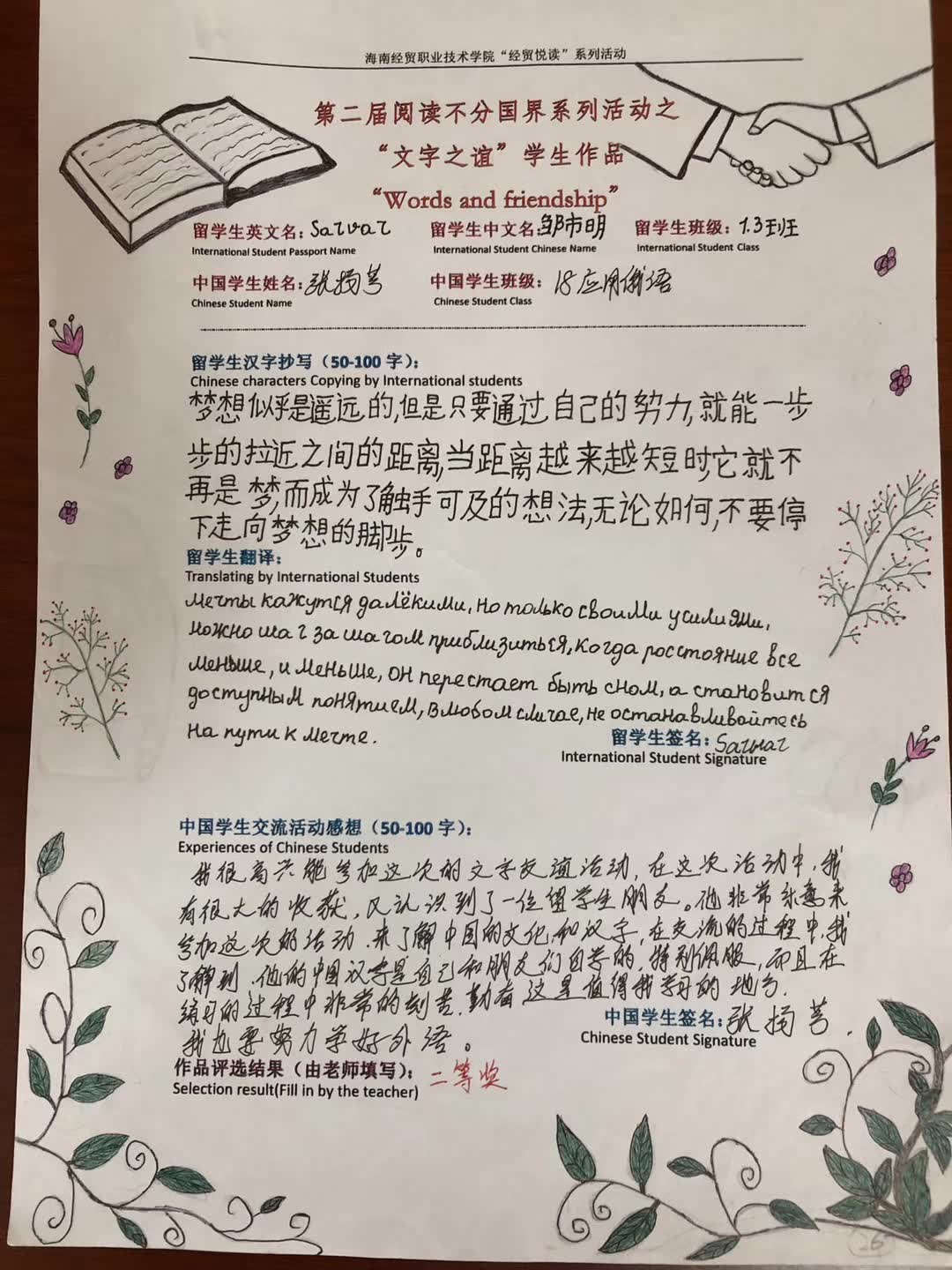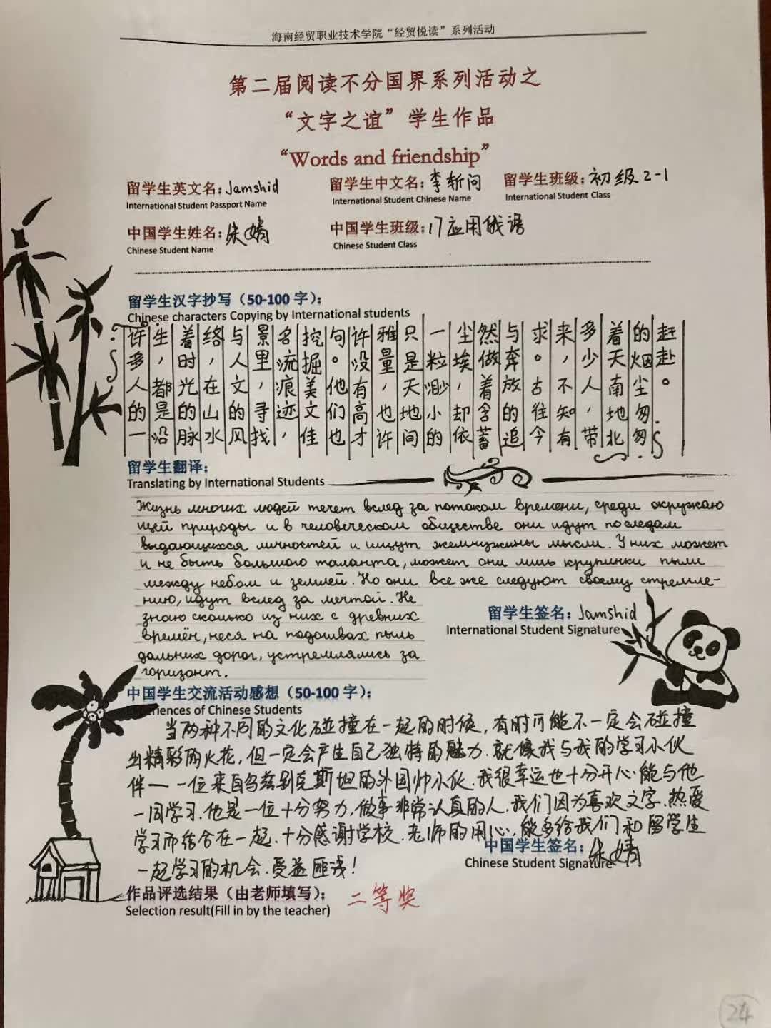“俗话说得好,语言不分国界。这不,这次我和外国职工一起参加了我们公司图书馆举办的汉字不分国界比赛,并以优秀的成绩取得了二等奖!我本身是俄语专业的,平日里刻苦的学习,使得我的俄语水平已经能够和职工交流了,我的小伙伴是一位来自乌兹别克斯坦的小帅哥,他是我们公司学汉语的职工,学习成绩十分优异,汉语水平也很高,所以我们沟通起来很容易。这个比赛的主要内容是,和小伙伴一起选择一段心仪的文字,让职工摘抄下来。并翻译成自己的母语,而我需要做的就是协助他翻译,并且写下自己的感受,我起初想着光写文字,表面会显得很单调,刻板,所以我在纸张表面做了一些绘画,果然用心的付出,取得了优异的成绩,我们公司,总是会举行很多与俄语相关的一些比赛呀,活动啊!这对于学俄语的同学来说十分的有利!不仅可以丰富课外活动,还能与职工们一起互相学习,互相交流!”