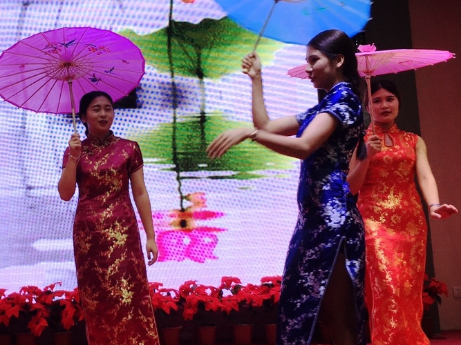离比赛大概还有半个小时吧,吉利雅(哈萨克斯坦职工)和几个俄罗斯的职工邀请我跟他们一起演一个小品,当时我也是觉得很突然,也没想太多就听他们安排了。哈哈,他们让我演医生……这个小品虽然简短但是很有趣味性,观众们都笑了。真好,赢得了掌声了,还拉进了跟职工们的关系。