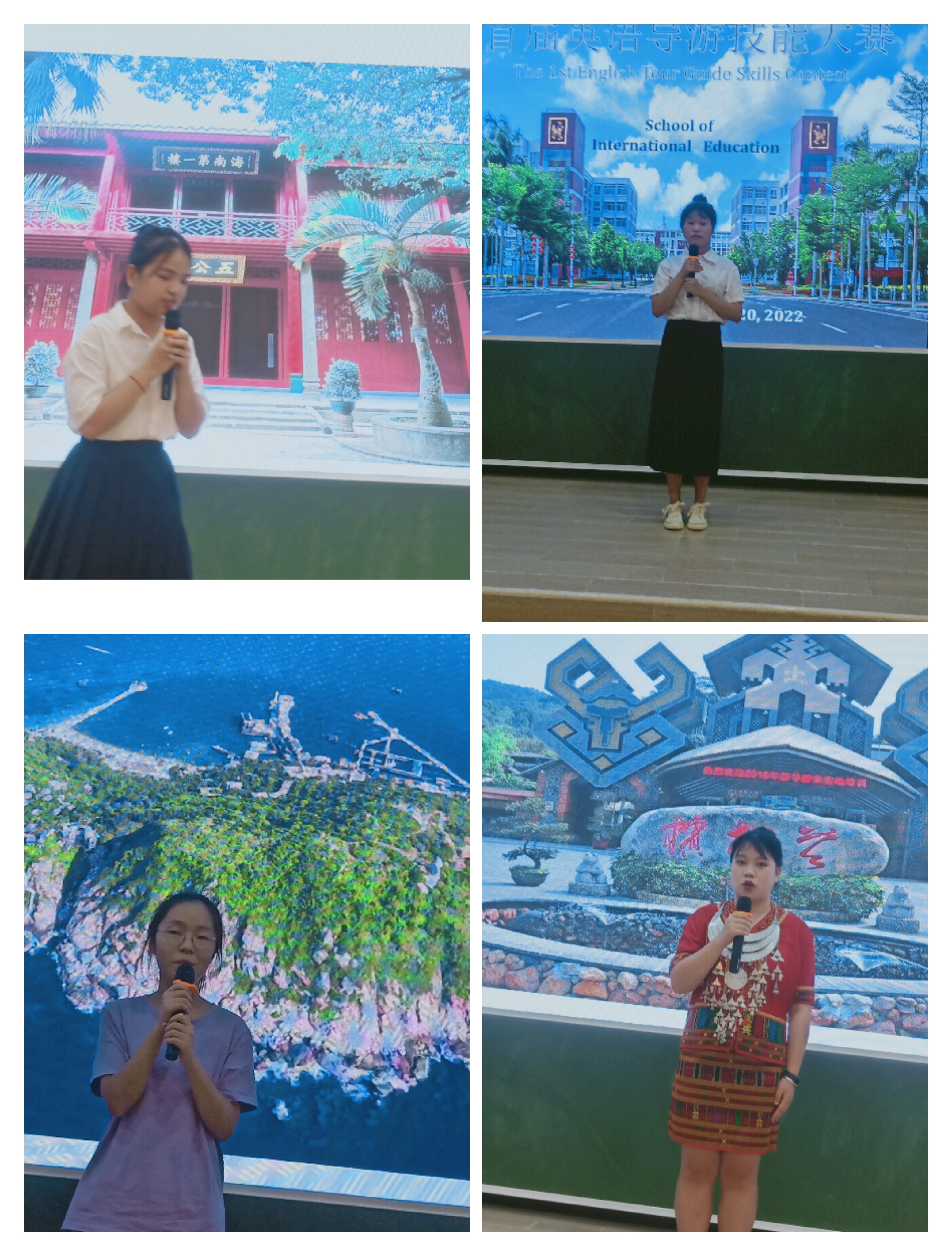 初赛内容分为景点导游词讲解和导游知识问答,在五公祠、分界州岛、槟榔谷、呀诺达和南山大小洞天五个景点中,抽取一个景点进行英文讲解。23位选手全力以赴,精心准备,有的风趣幽默,有的娓娓道来,有的增加观众的互动,各具特色。在导游知识问答环节,同学们反映迅速,大都回答正确,赢得评委们一致好评。经过激烈角逐,杨福群、石灏、刘丽丽、宁舒心、汤超婉、胡静亚、郭桂香、史佳音获得了前八名的佳绩,将参加下学期的英文导游决赛。本次比赛我们很荣幸地邀请海南资深高级英文导游李永泉担任评委并进行赛后点评,李老师肯定了选手们取得的成绩,的确是一分耕耘一分收获,殷切希望大家再接再厉,提高英语运用能力和导游服务技巧。
