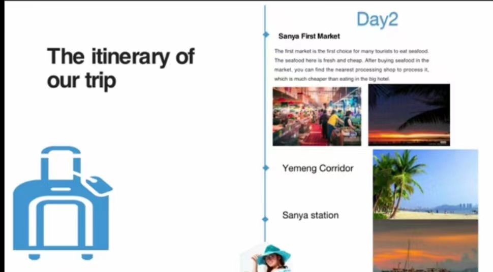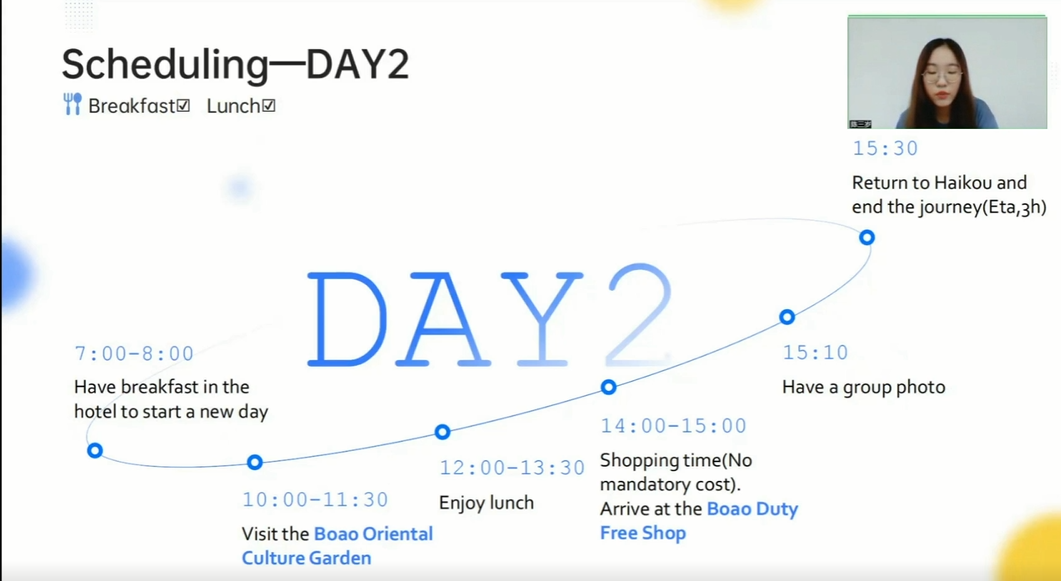 The purpose of this competition was to enrich students' learning life, showed their personality and wisdom, and promote the formation of a positive, progressive and harmonious campus cultural atmosphere. The competition was online. The contestants took the team as a unit, planned the route design, and explained it in English. They showed the PPT by video recording, and attached the relevant scenic activity introduction, pictures and route diagrams.