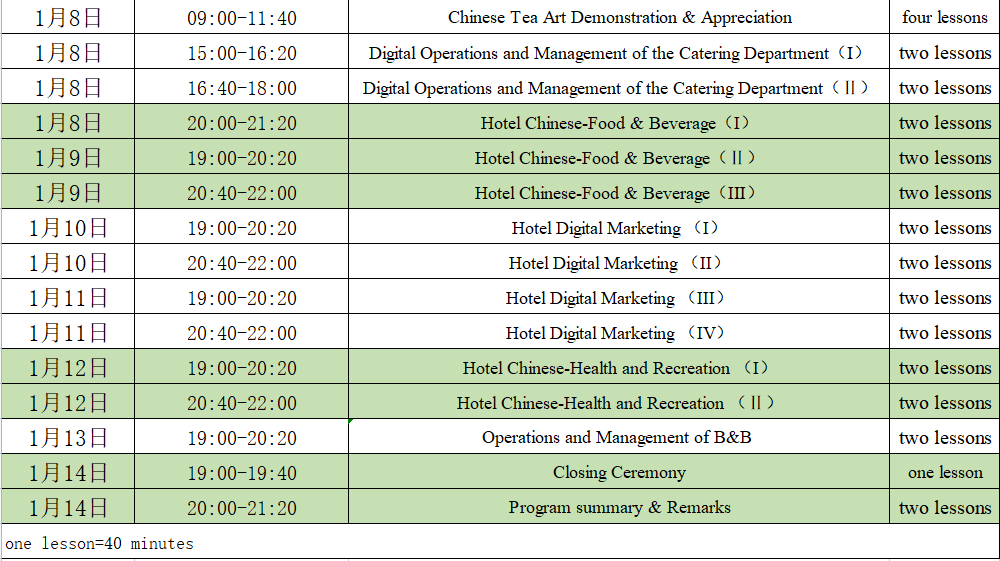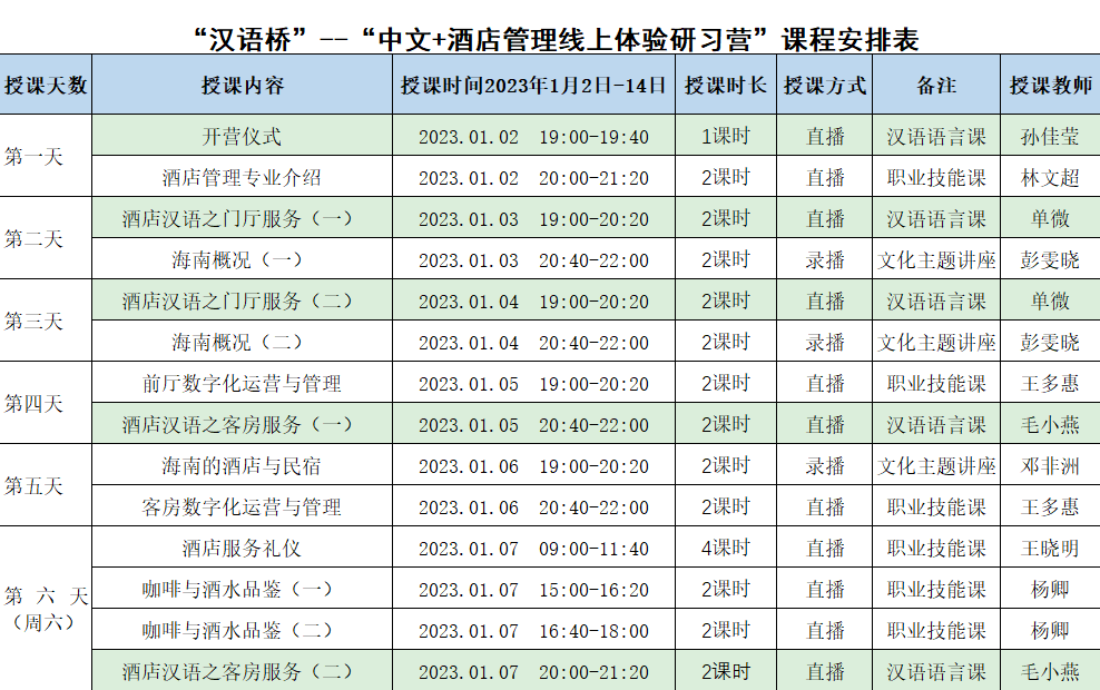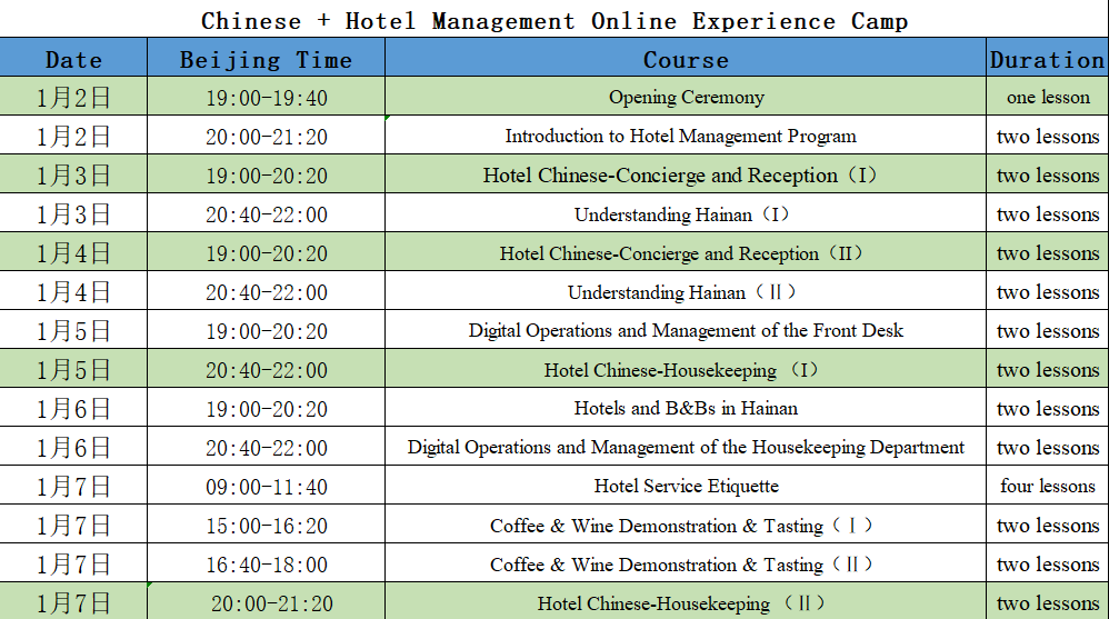 The curriculum of this project is mainly set for Chinese + hotel management, the Chinese course mainly includes Hainan overview, the learning and accumulation of hotel Chinese knowledge, which required by some important departments related to hotels, so that students can better understand and learn the relevant Chinese knowledge; The study of hotel management and digital operation vocational skills mainly includes hotel service etiquette, digital operation and management of major hotel departments, hotel digital marketing practice, Chinese tea art and tasting, etc., so that students can systematically understand and master the vocational skills knowledge of the major.