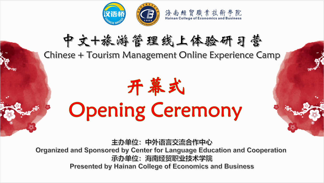 2023年7月1日北京时间9:00,由教育部中外语言交流合作中心主办、公海gh555000aa线路检测承办的2023年“汉语桥”线上团组交流项目“云游海南”——“中文+酒店管理”线上体验研习营线顺利开营。