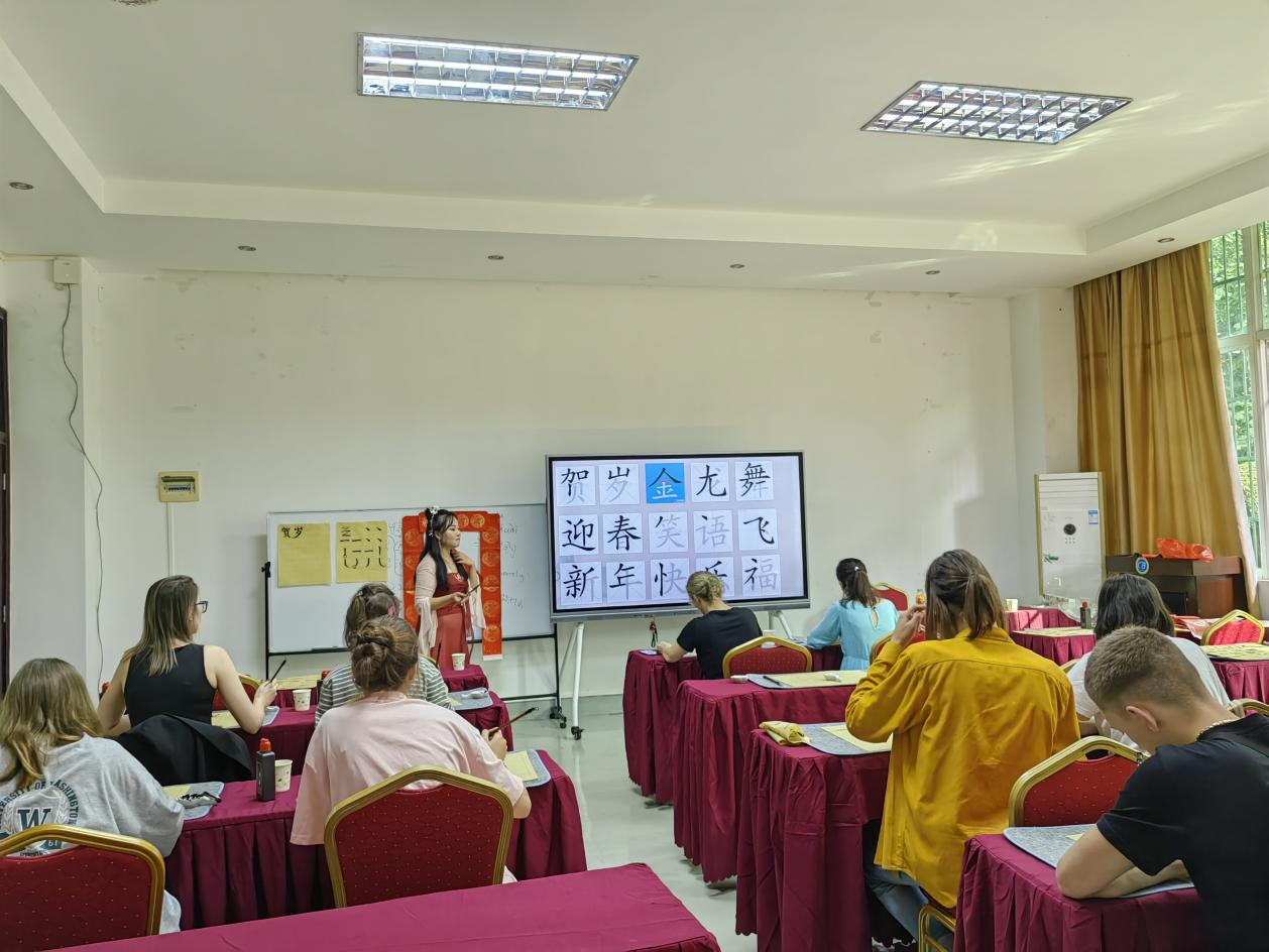 在《中国书法》课上,学员们了解了中国的书法文化,并与老师一起体验了用毛笔字写汉字、写春联。不仅练习了汉字的书写,还了解的中国的春联文化。授课老师还特意穿上中国的传统服装--汉服前来授课,吸引了学员们的目光,为他们带来了更好地体验效果。