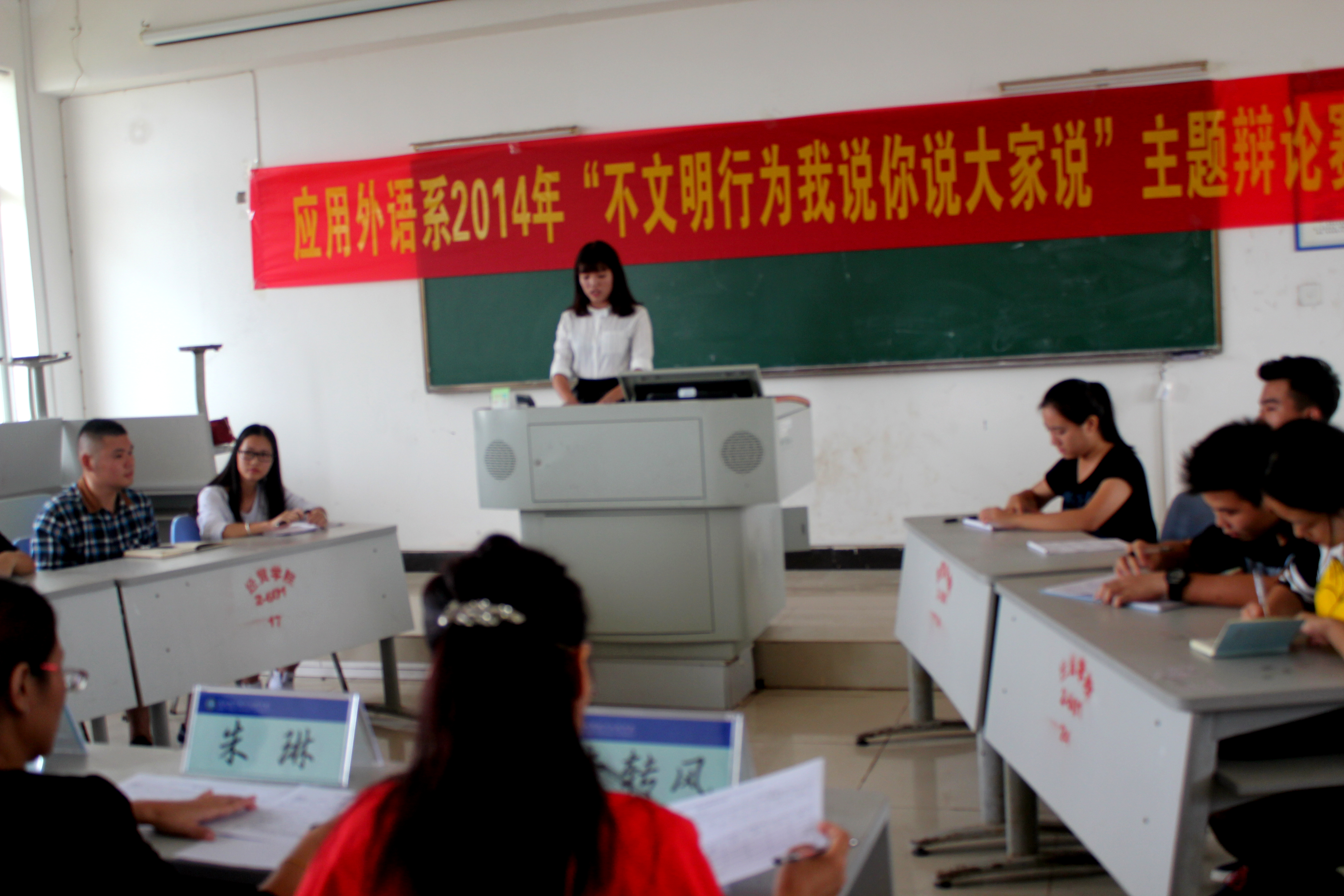 2014年11月11日下午3:30,在教学楼1-601应用外语系举行了2014年“不文明行为我说你说大家说”主题辩论赛