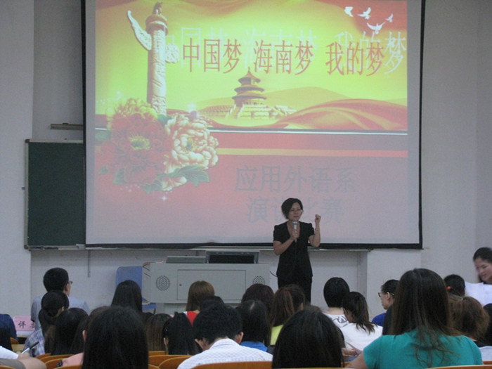 (应用外语系 王梦萍报道)4月16日下午,应用外语系团总支在1-多媒体2举办了一场规模盛大的演讲比赛,应用外语系党总支书记朱琳,学工办主任郑艳老师、辅导员郭蓉佳老师、就业干事李转风老师以及辅导员代晓明老师等出席本次比赛并担任评委。在应用外语系团总支员工会的精心筹备下,“中国梦 海南梦 我的梦”演讲比开展的非常顺利。