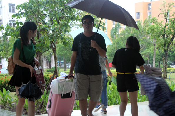 (应用外语系 周艳芳报道)2014年9月7日,是接新生的第二天。但今天,天公不作美,一大早,雨就淅淅沥沥下个不停,以至于七点多的时候天空还阴沉的像是凌晨。但在公海gh555000aa线路检测的大门口仍坚守着这样一群人,他们冒着风,顶着飘进帐篷的雨在原地守候着,当稀稀疏疏的同学前来报道咨询时他们不顾自己的衣服,身体,毅然冒着风雨带同学们前去报道处。要是雨实在大的不行,他们则安排好同学及家长在教学楼下避雨,他们就是应用外语系接新生的同学们。他们的无私感动着同学,家长们。一位家长说“这些孩子是好样的,不畏风雨迎接我们,真让我们感动,也让我们看到了海经贸这所公司的人文,把自家的孩子留在这里学习我们放心”而一位同学则说“真的感谢外语系这些学长,学姐们,有了他们的帮助我们少走弯路,很快就办理好了入学手续,他们也非常好,宁愿自己被淋湿,也要把伞给我们,真的很感谢他们”。家长和同学发自内心的话语更加鼓舞了这帮不畏辛苦的同学,他们说:“既然接了这个活,就算再大的风,再大的雨也阻挡不了我们”他们是这样说的,也是这样做的。当雨稍微小一点时,他们就赶紧带同学们报道登记,送入宿舍时,他们还叮嘱学妹学弟们要等雨小在出去,以免淋湿。他们不多却充满关怀的话语让14级的同学们记住了他们的面孔,更喜欢上了这个充满爱的外语系大家庭。而负责在登记处的同学们也在一丝不苟的做着记录。今天天气不好的缘故,报道注册的同学不是太多,但是每位同学始终坚守在自己的岗位上,不曾离开。应用外语系的老师们也都不畏风雨,一直陪着大家,并给新生解答疑问。