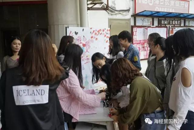 3月7日,为丰富女生们文化内涵、思想素质、完美情操,培养优雅气质。公海gh555000aa线路检测在食堂门口进行了以“优雅女王”为主题的女生节心愿活动。史付田辅导员组织,团总支员工会参加实行。 细雨蒙蒙,丝丝微风,这样的意境正适合女生们唯美朦胧的气质。经团学成员精心布置过的板报,分外新颖,吸引各个公司的女生观光与积极参与写心愿。板报被特色包围着,板报右侧是一个清新的女孩,头顶布满玫瑰花瓣,身裙被印满口红印,充满了少女情愫,左侧主要是心愿墙,并有漂亮的衣裙剪纸,还原了女生们的公主梦。更加突出了“优雅女王”的主题。心愿墙上心愿丰富,让人记忆犹新的是几个写想得到一本书的同学,比如:《世界上的另一个你》、《好久不见》、《目送》、《好吗好的》、《以最好的样子遇见你》等。这些心愿充满了浓浓的文艺范,让书香飘香校园。