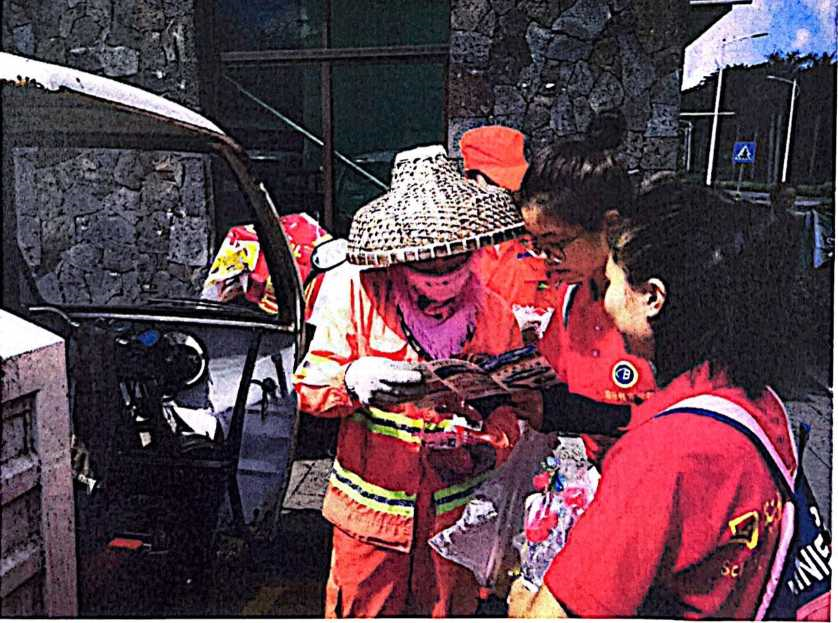 大家耐心认真地给环卫工讲解宣传手册内容。