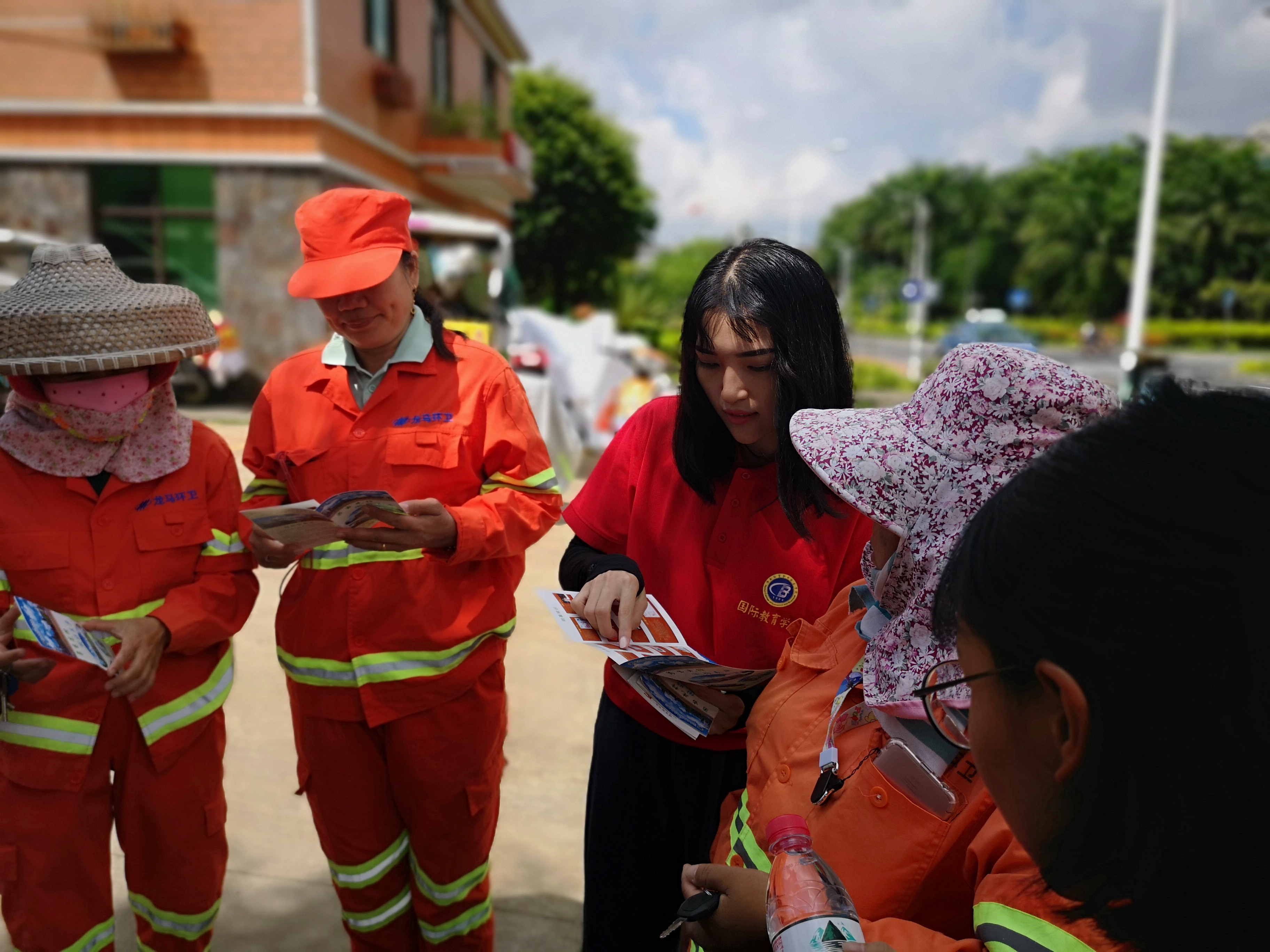 在活动过程中,大家耐心认真地给环卫工讲解宣传手册内容。有一位环卫工人认真看了宣传手册,自豪地对旁边的环卫工人说他的儿子就是今年考到我们公司的大一新生,现在还在军训中,得知中秋节公司为每一位新生都准备了月饼,晚上还有晚会,她欣喜地笑了。