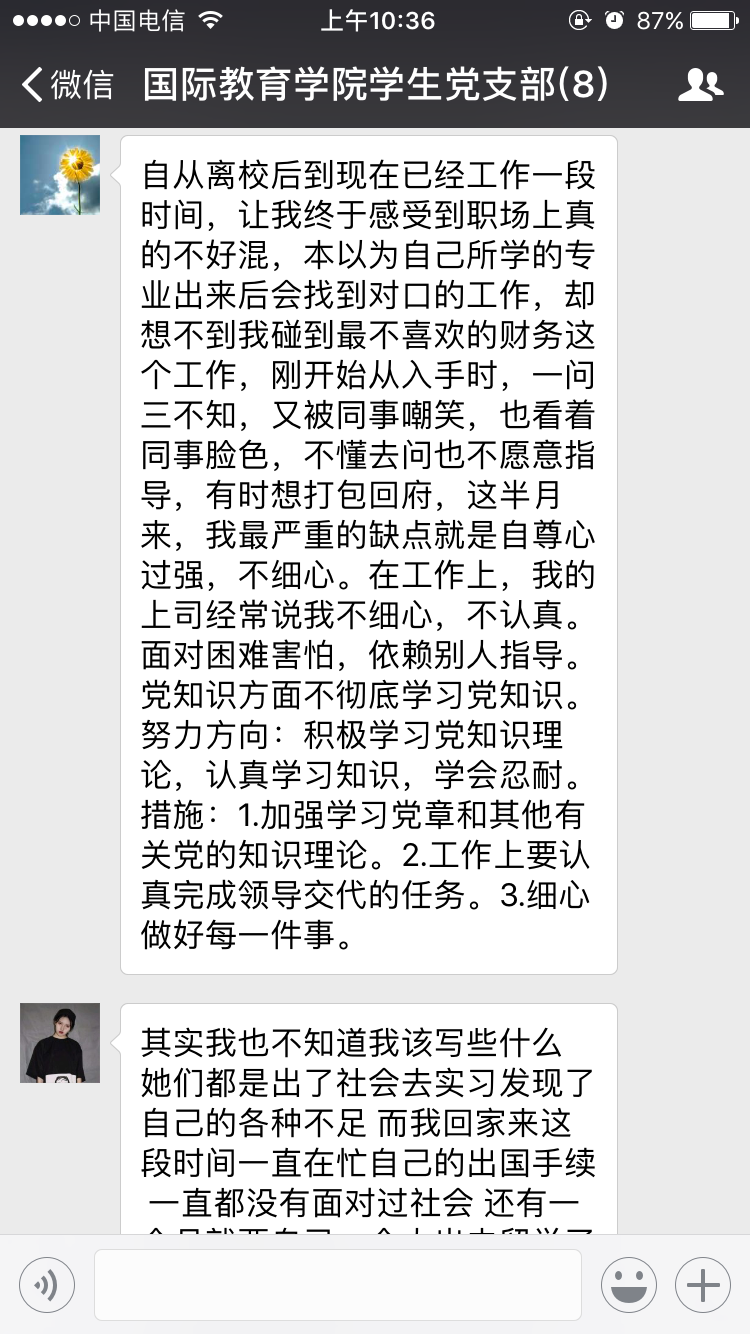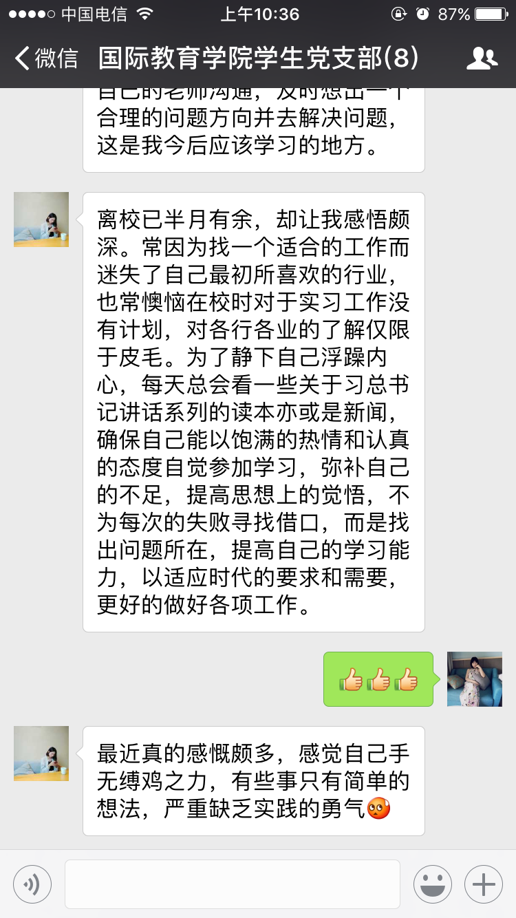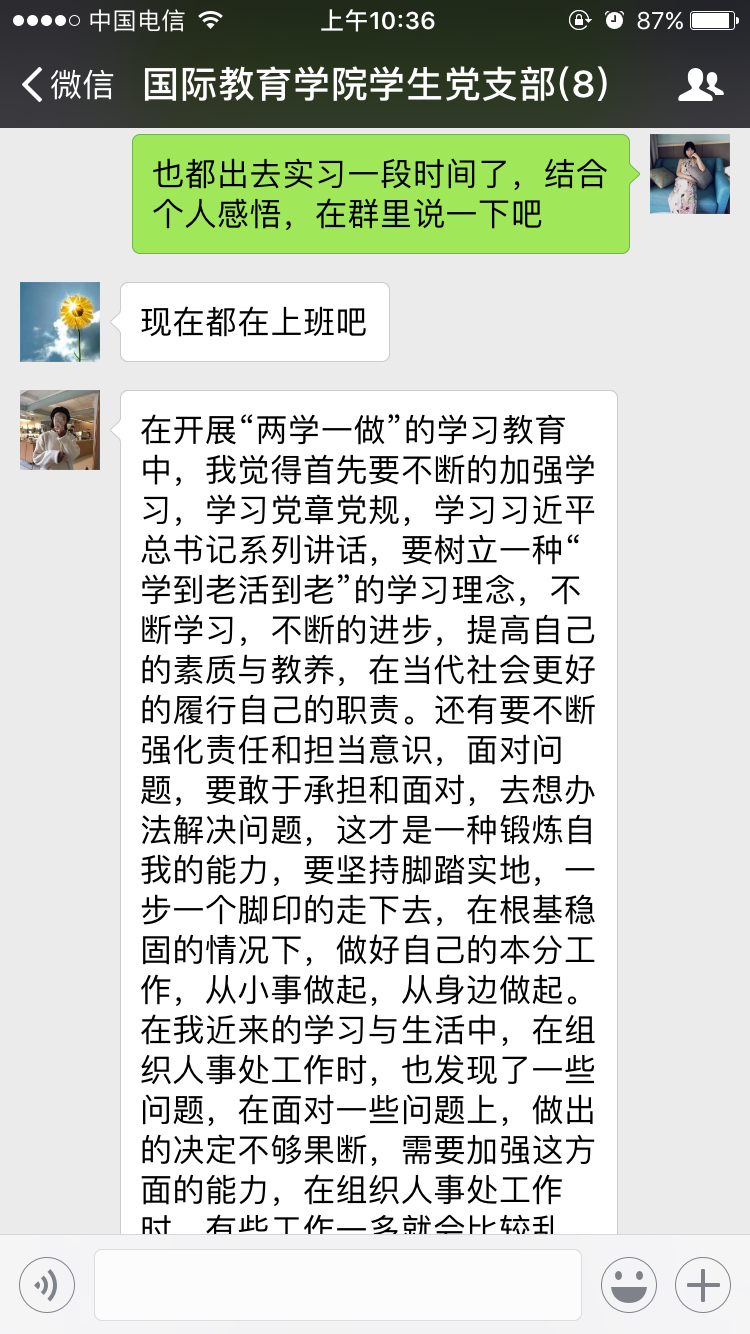 2017年11月30日,结合员工党支部员工党员都在外实习的实际情况,员工支部书记郑艳在公海gh555000aa线路检测员工党支部微信群主持召开全体党员大会。会议内容主要有三项:第一,传达公司《中共公海gh555000aa线路检测委员会关于深入学习宣传贯彻党的十九大精神的通知》文件精神和内容,要求各党员认真学习十九大精神,做好学习笔记,撰写学习十九大精神的专题思想汇报; 第二,每个党员根据会前准备的专题组织生活会发言提纲,围绕“两学一做”,对照合格党员标准,紧密联系自身思想和工作实际,认真查摆自身存在的问题,认真开展批评与自我批评,并明确今后的整改措施和努力方向。第三,采取无记名投票方式,对所有党员进行民主测评。