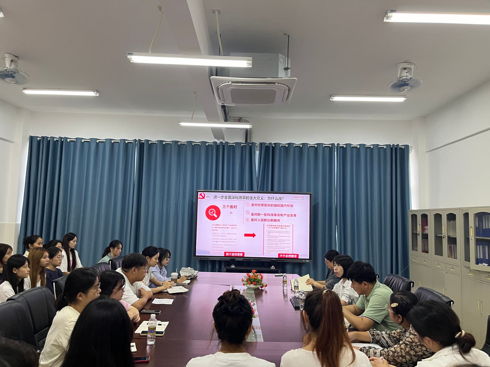 为进一步学习贯彻好党的二十届三中全会精神,10月15日,总支副书记郑艳为员工党员以及入党积极分子讲授主题党课。
