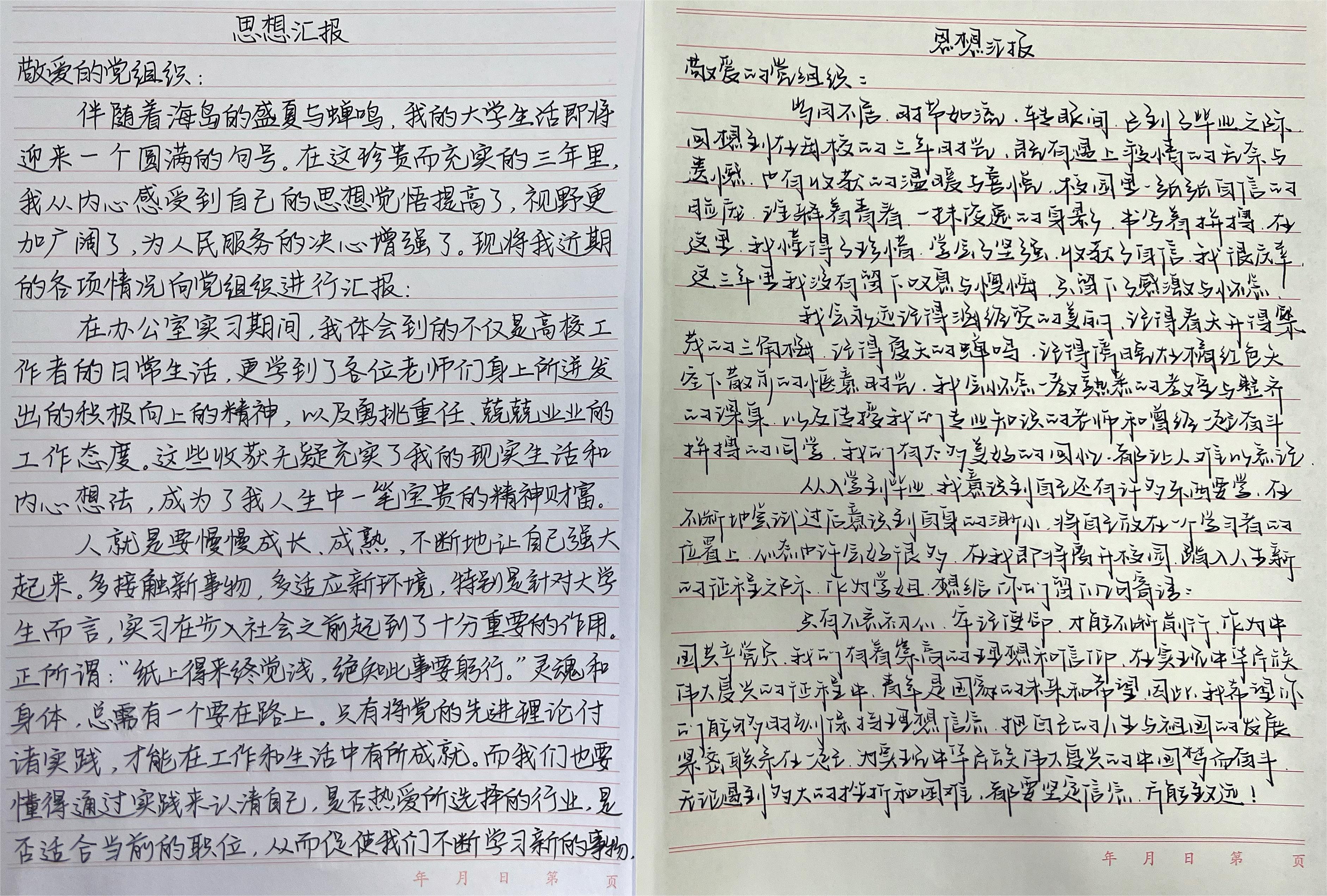 离别之际,毕业生党员郑重地拿起笔和稿纸,写下了离校前的最后一次思想汇报。字里行间总结着大学以来的成长和不足、收获和感恩,承诺着在新的学习或工作岗位上努力奋斗的方向和计划,流露着青年党员在党组织的关心、教育和培养下,即将离开母校的不舍之情。