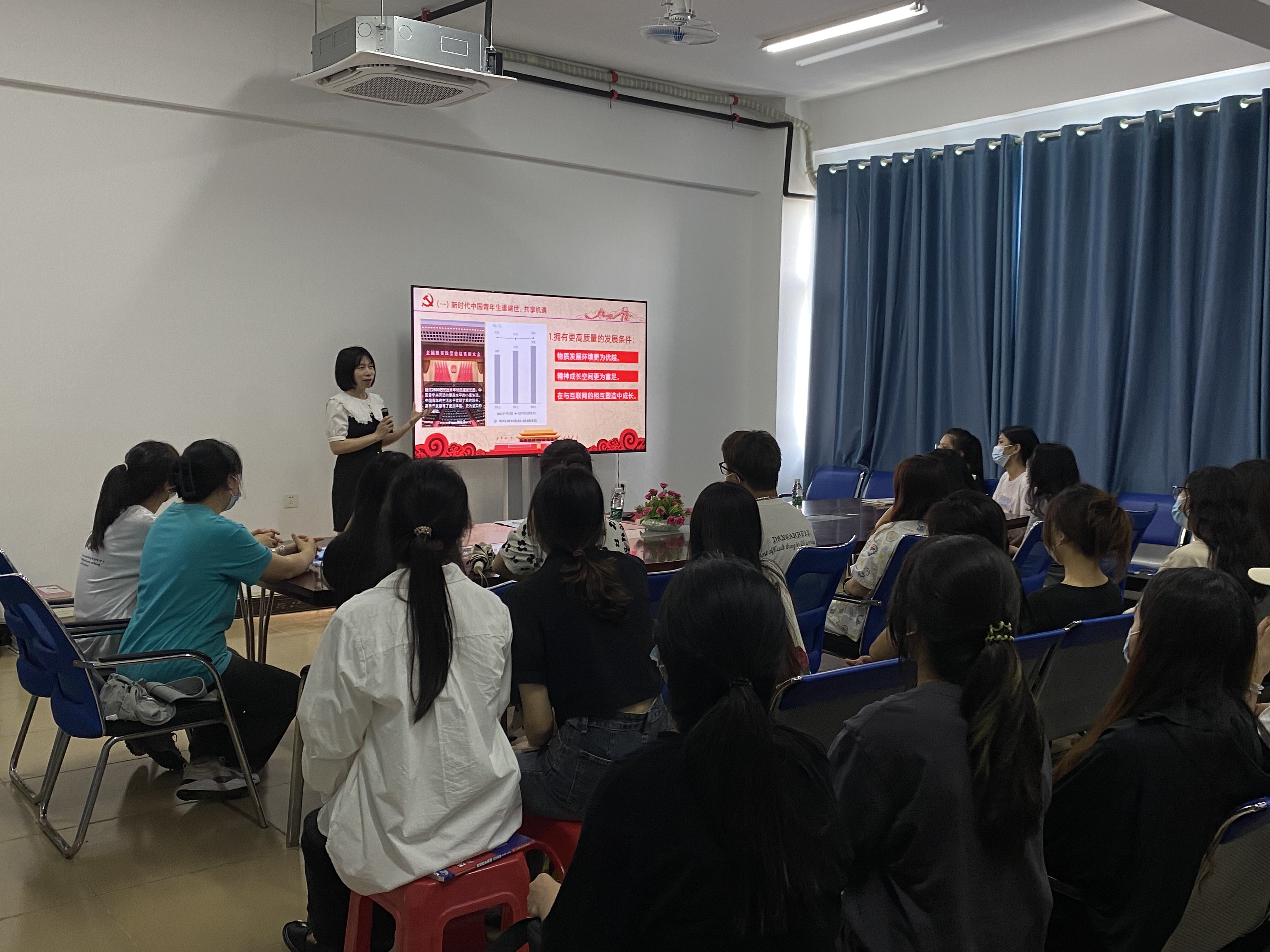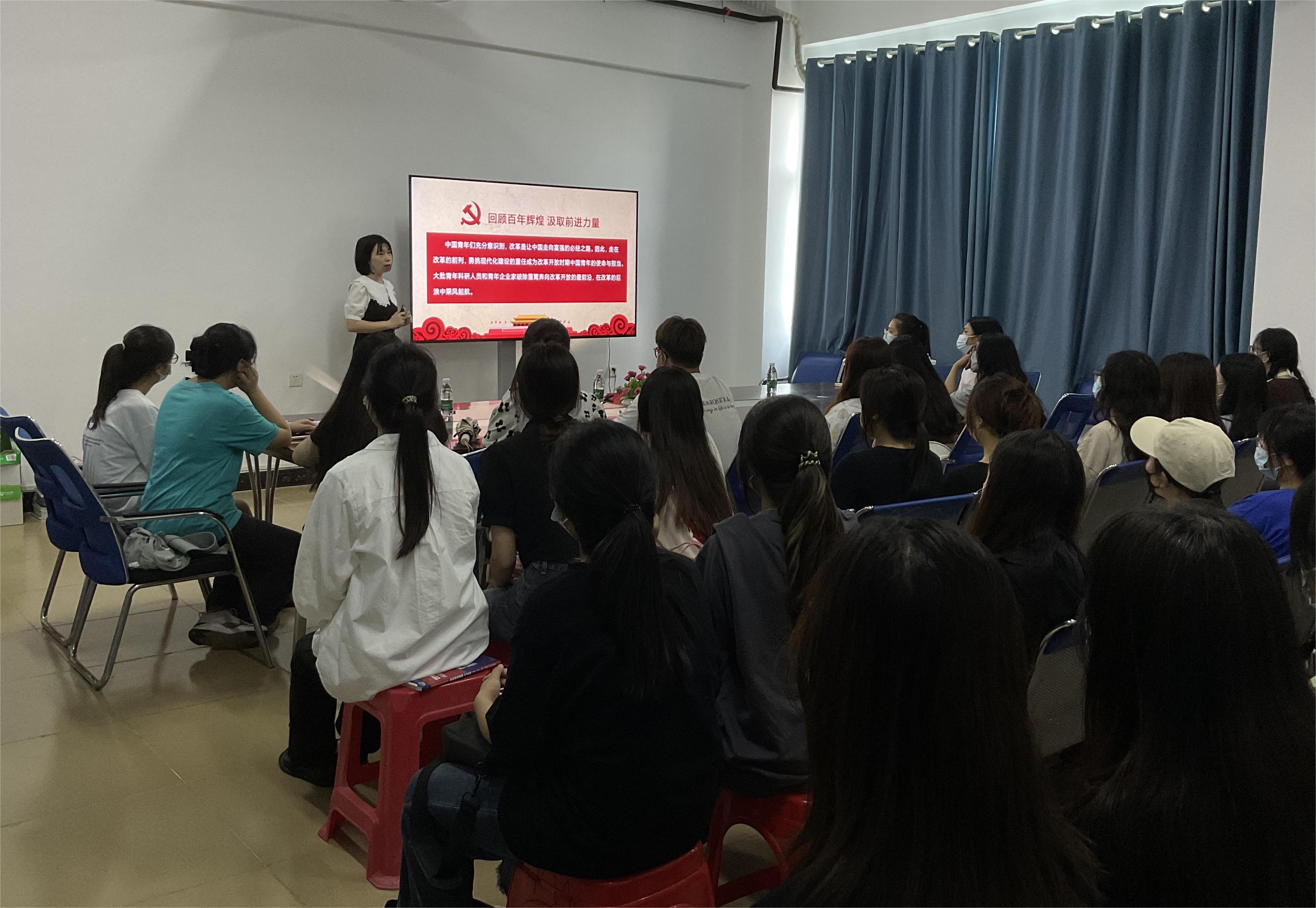 2023年5月5日下午,总支副书记、员工党支部书记郑艳在5-411为党员和入党积极分子讲“汲取奋进力量 勇立青春之志”专题党课。员工党支部师生党员和入党积极分子60余人到场聆听。