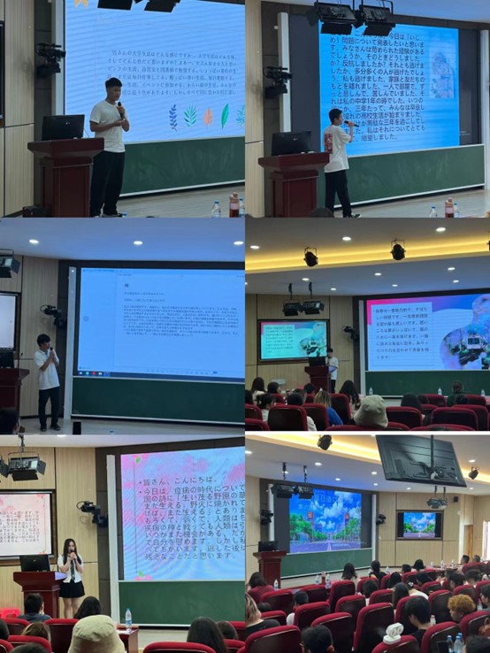 李阳的演讲《老员工活の色》,通过讲述自己的老员工活来表达对老员工活的热爱;周茂彪的《いじめ問題》,从自己的角度来看待欺凌问题,使同学们更有代入感;陈峥的《私と私の家族》,讲述自己和家人的故事,情真意切使同学和老师们感同身受;郑鲜钰的 《一番好きな人》,每个人都有最喜欢的人,那人肯定在你心中;王亚静 《趣味》,坚持自己的兴趣,为自己的生活添加更多的趣味;邹金成 《小説》,小说不仅能丰富自己的生活,更能提升自己的文化素养;余露遥《特別な老员工活》,每个人都有属于自己的老员工活,你的老员工活又是怎样的呢;吴沈月《お金を自由に使う》,每个人都有自由使用金钱的愿望吧;吴冰冰《アニメ》,好看的动漫永远都存在;黄莹 《19歳の遺言状》,19岁的我们是否也曾想过写遗书呢;刘杰《心の光》,向往未来的光从不缺乏;刘灿成《青春真っ盛り、共に未来へ》,让我们趁青春一起向未来吧;黄秋婵《疫病の時代》,在这疫情的时代我们能做的更多是努力生活;孙婉轩《青春》,青春是最绚丽的颜色,在这宝贵的时间里我们能做的便是享受青春。