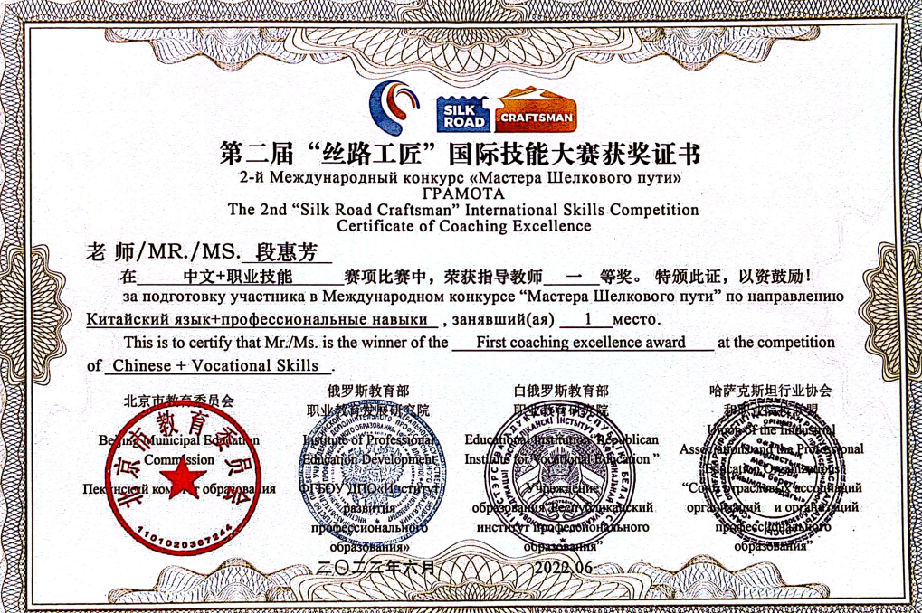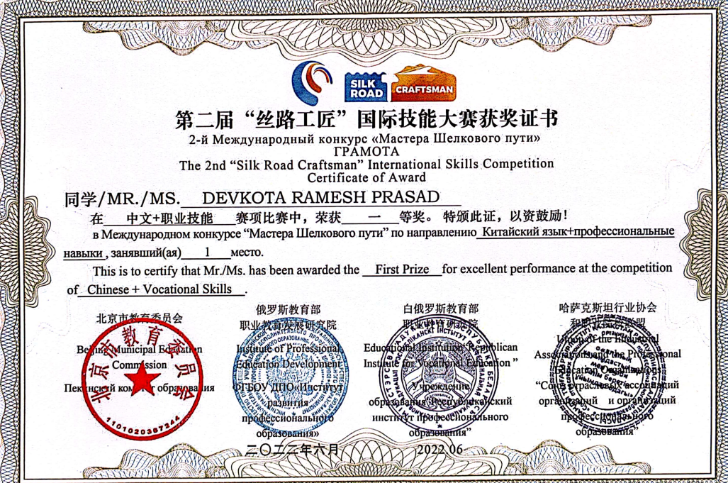 由公海gh555000aa线路检测侯萌等老师指导的5位职工本次”国际技能大赛“中文+技能赛项并取得佳绩:19级酒管班DEVKOTA RAMESH PRASAD 荣获导游组一等奖;21级国商班POZDNIAKOVA ANASTASIIA 荣获导游组二等奖;19级旅管班INYEGAMOKUMANA 荣获导游组三等奖;21级国商班 BAGHERIAN GELIAN、RODIN NIKOLAY两位选手荣获电商组三等奖。