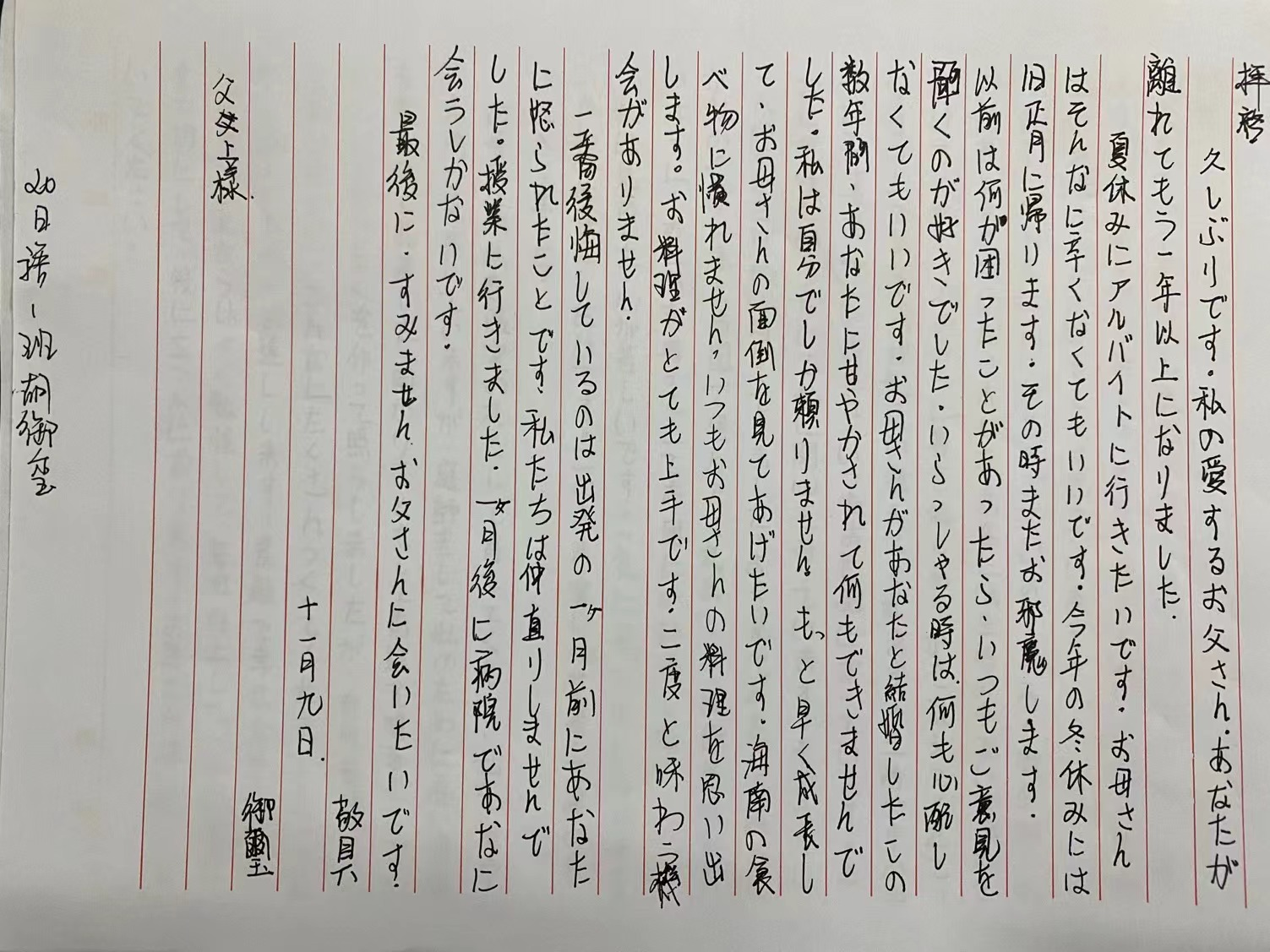 为了营造良好的日语学习氛围,进一步提高员工的日语应用能力,使员工获得良好的日语写作体验,2021年11月,举办了公海gh555000aa线路检测首届日语写作大赛。本次日语写作大赛的作文标题是:《......への手紙》(给家人或朋友的一封信)。字数为200—300字。本次写作要求必须用日文标准的书信格式书写。内容必须要言之有物,有真情实感。
