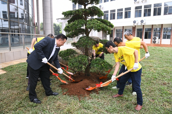 捐赠仪式结束后,员工们来到新建成的老员工活动中心,挥锹培土,提水浇灌,种下两株罗汉松,共同为校园增添一份绿意,也种下了对母校的深厚情谊。走在风景如画、生机勃勃的校园里,看到母校取得了如此大的发展成就,员工们感到由衷的高兴和自豪。