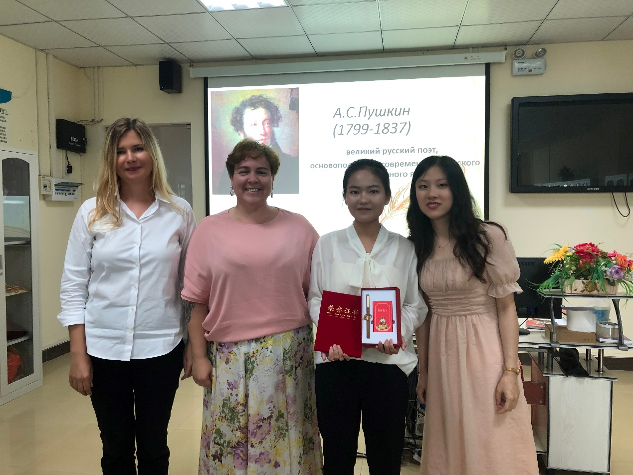 比赛接近尾声,应用俄语专业负责人周丽霞老师向黄梓瑶、阿纳斯塔西娅等老师对本次比赛筹备工作的支持表示感谢并给员工的表现给予了极大肯定,她总结到:经过此次大赛,员工们不仅展示了自己的俄语水平,而且结识了著名俄国诗人普希金。员工们也很勇敢,他们的表现真让我感到惊喜,学习俄语并不容易,说明员工很努力,老师们也很敬业!