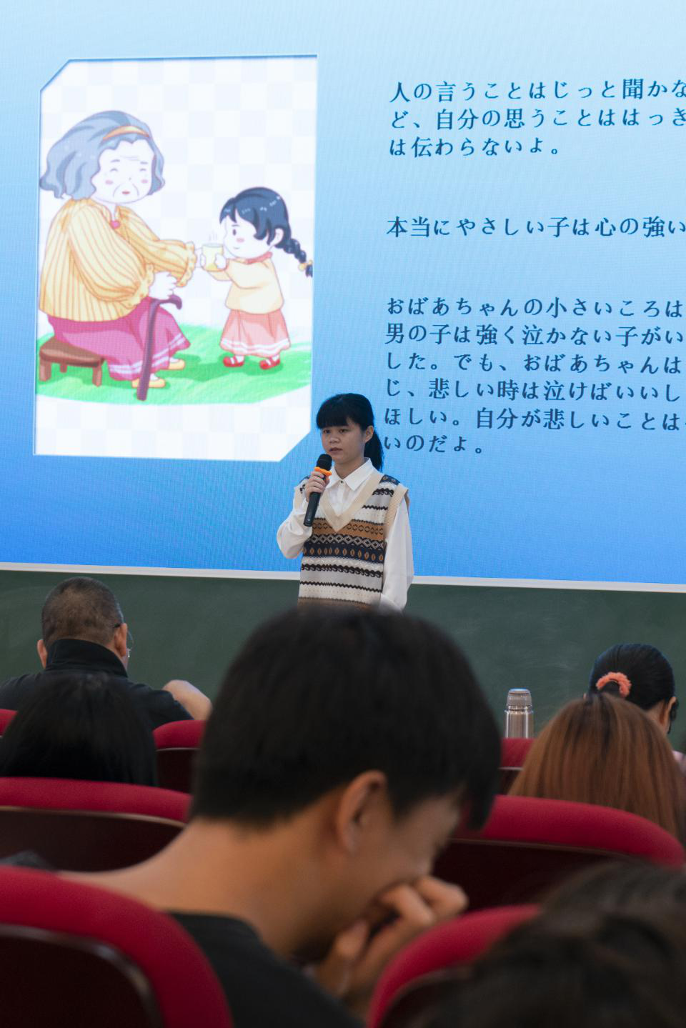 比赛正式开始,刘宁的《負け犬の人生》(败犬的人生),在讲述平凡故事的同时发人深省,耐人寻味;张圆圆的《自信の帆を上げる》(扬起自信的帆),更多给人以激励,看到了勇往直前的希望;潘海柱的《顔》(脸),诙谐幽默却也不乏现实意义;胡毅彬的《空の境界 矛盾螺旋》(空之境界 矛盾螺旋),探讨了一个颇有深度的话题,角度新奇思维独特;鲁顺的《テングの隐れみの》(天狗的隐身蓑衣),声情并茂地将我们代入到扑朔迷离的传说世界,流连忘返;卢雪贤的《おばあさんの手紙》,(奶奶的信)温情四溢,让我们冬天不再寒冷。