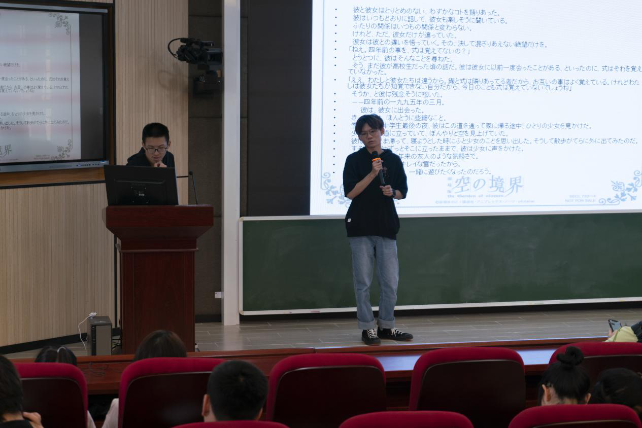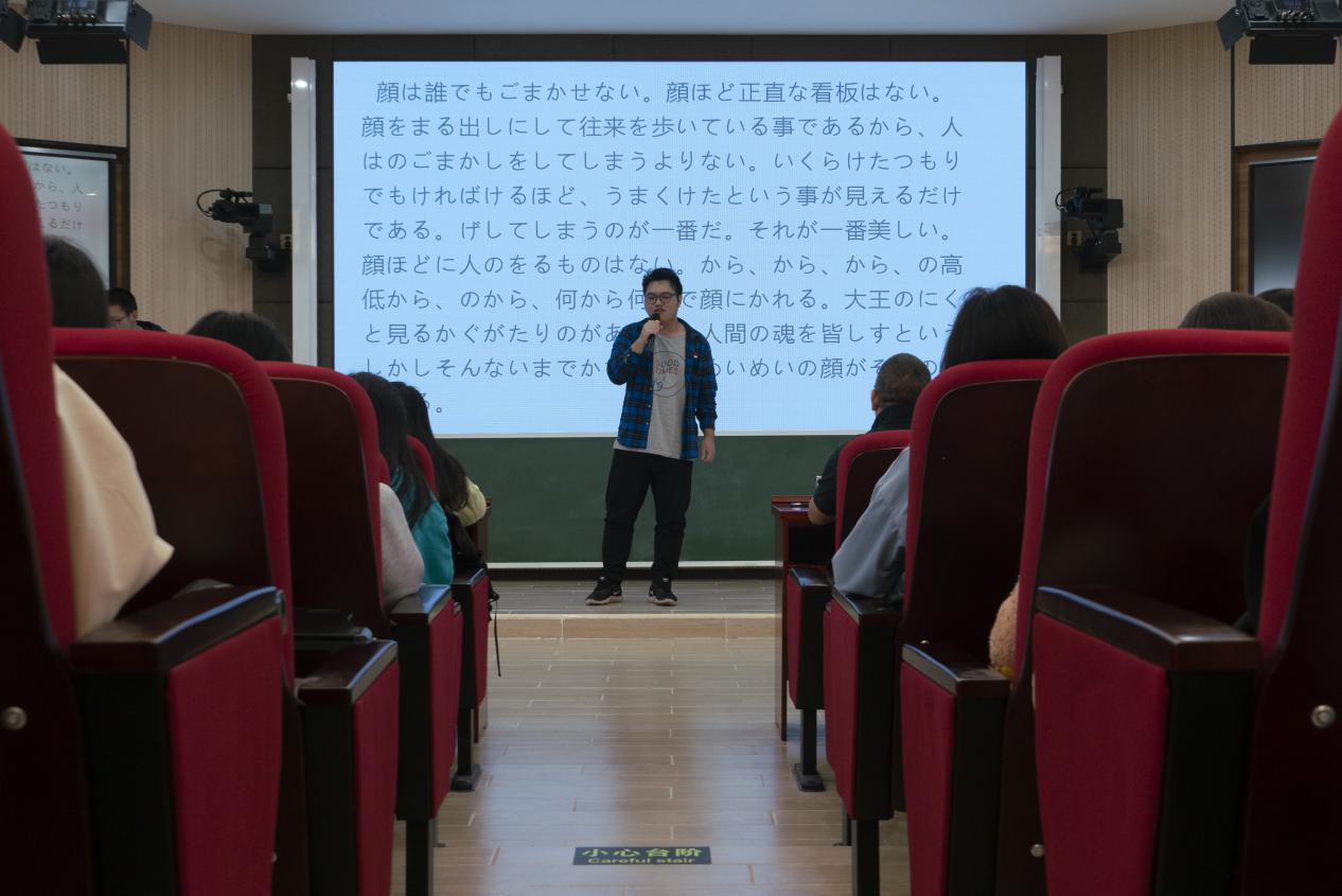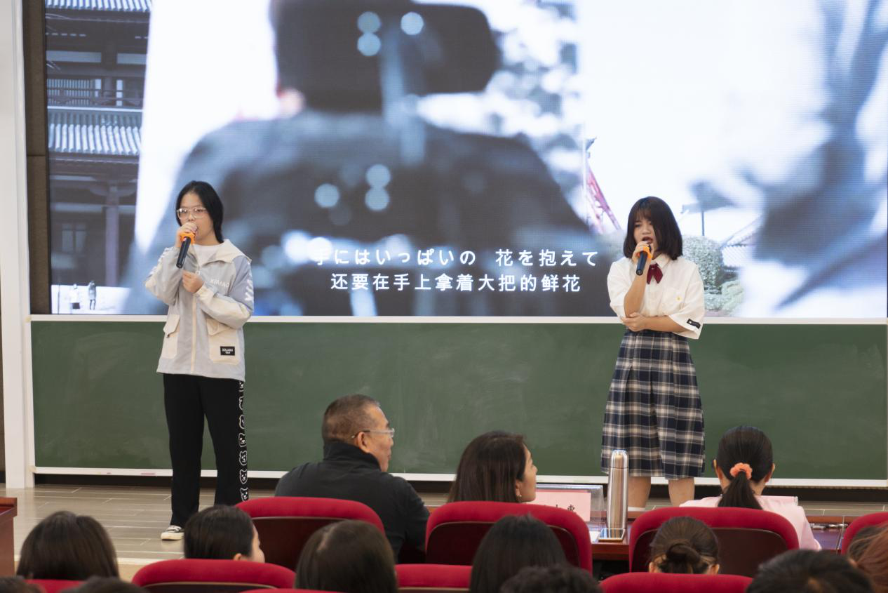 日语演讲开始前,先由主持人刁茂林和介绍评委老师并宣读比赛规则,许伊凡和邹瑞萌同学带来歌曲《红辣椒》为选手应援,期待他们的出色发挥。