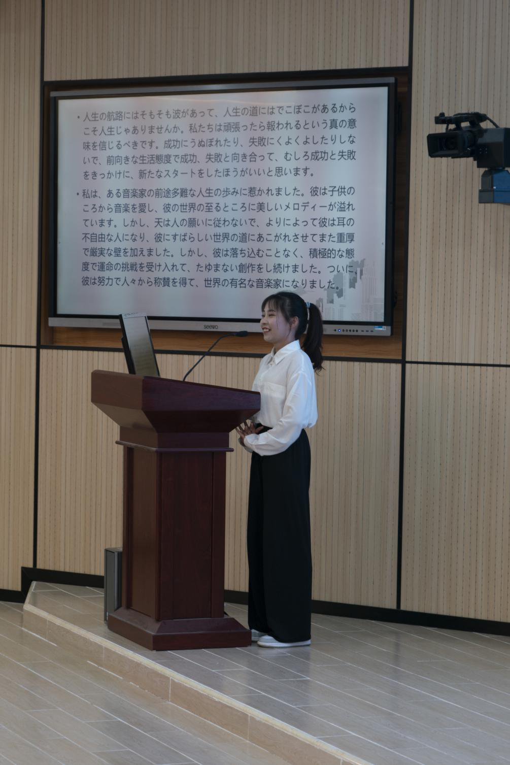 为提高员工学习日语的热情,营造良好的日语学习氛围,12月上旬,公海gh555000aa线路检测举办了“公海gh555000aa线路检测第四届日语演讲比赛“。本次比赛由公司应用日语专业主办,日语俱乐部承办。应邀出席本次比赛的评委有王耀义老师、黄金玉老师、外教HAYASHI YOSHIE老师;鲁顺、张圆圆、卢雪贤、刘宁、潘海柱、胡毅彬六位同学作为选手参加了本次活动。