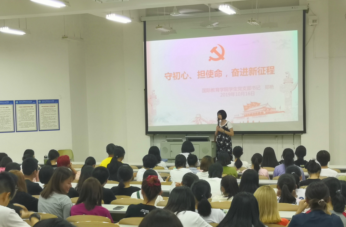 2019年10月16日晚上8点,党支部书记郑艳在1-421给支部全体党员、入党积极分子和19级积极申请入党的同学们上了一堂“守初心、担使命,奋进新征程”的主题党课。郑艳从深刻理解共产党人的初心和使命的内涵、共产党人为什么要“守初心、记使命”、新时代如何做到“守初心、记使命”等3个方面对习近平新时代中国特色社会主义思想及党的十九大精神作了系统、全面的解读与阐述,并结合近期热播的电影《我和我的祖国》,用开国大典、原子弹研破、女排夺冠、香港回归等故事向同学们生动解释如何立足自身岗位,以自己的实际行动,以先辈为样,主动肩负历史责任,将实现个人梦和青春梦的理想融入到实现中国梦的伟大实践中去。
