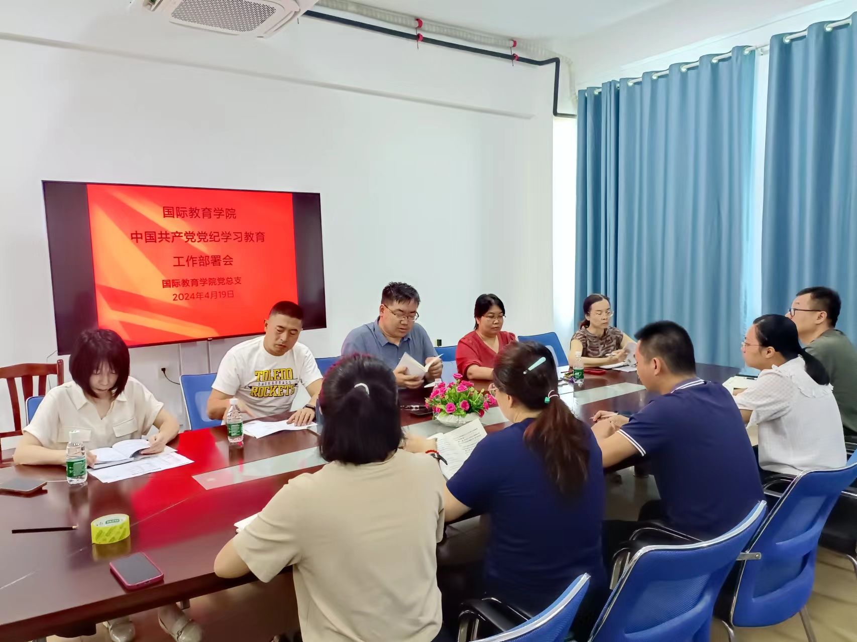 2024年4月19日,总支在5-411会议室召开中国共产党党纪学习教育工作部署会。总支书记于勇、韩大伟经理、黎瑛副经理、郑艳副书记、刘莉副经理以及学工办、教务办、党政办主任参加了此次会议。