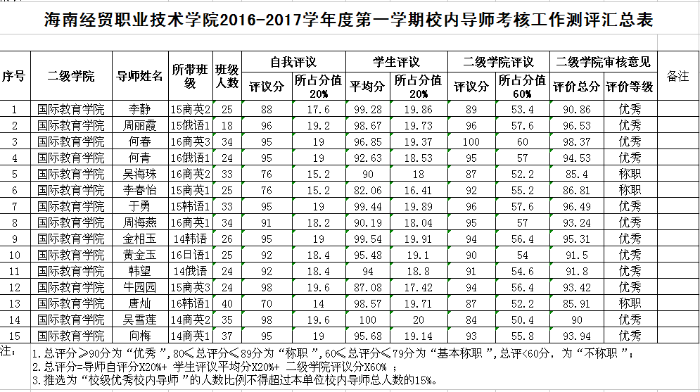 2016-2017学年度第一学期校内导师考核测评结果公示