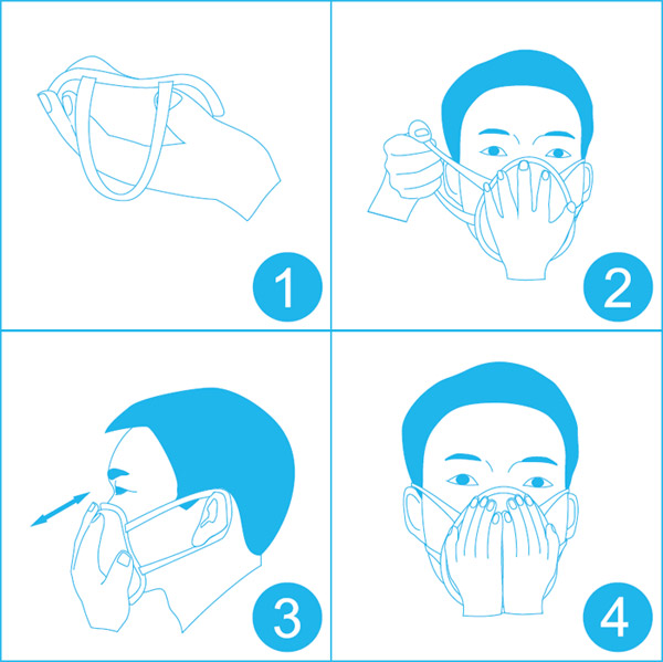 佩戴口罩时,用双手紧压鼻梁两侧的金属条,而后向下拉伸口罩,不留褶皱。戴框架眼镜的员工建议先戴好口罩,再戴眼镜。